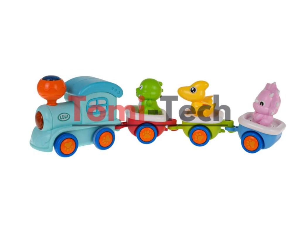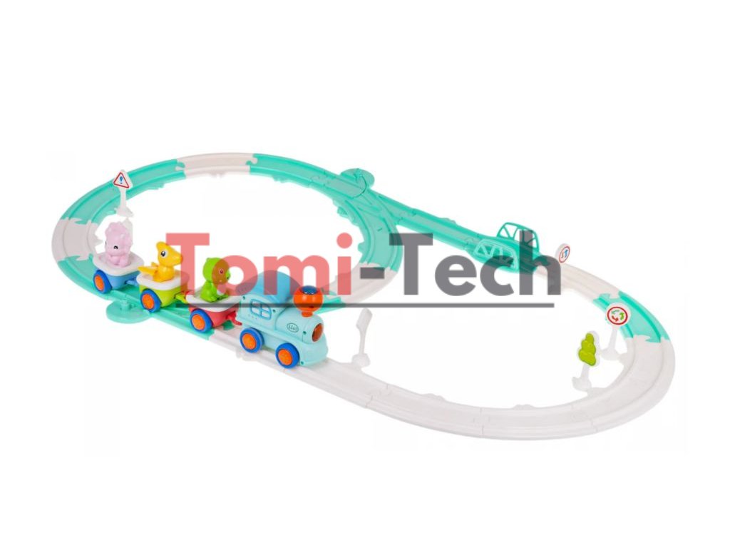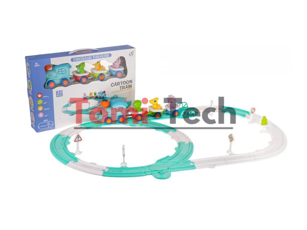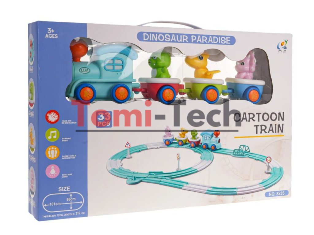 Súprava je vyrobená z najkvalitnejšieho plastu v živých farbách, ktoré podnecujú dieťa k hre a obsahuje 33 prvkov. Má 3 pripojené dinosaurie vagóny. Vlak vydáva zábavné zvuky a bliká svetielkami, keď sa rúti po koľajniciach. Každý vozík sa dá odpojiť a každý dinosaurus sa dá z vozíka vybrať. Sada obsahuje aj dopravné značky.