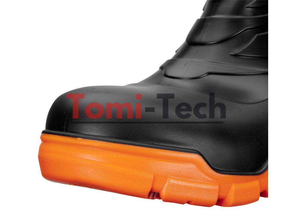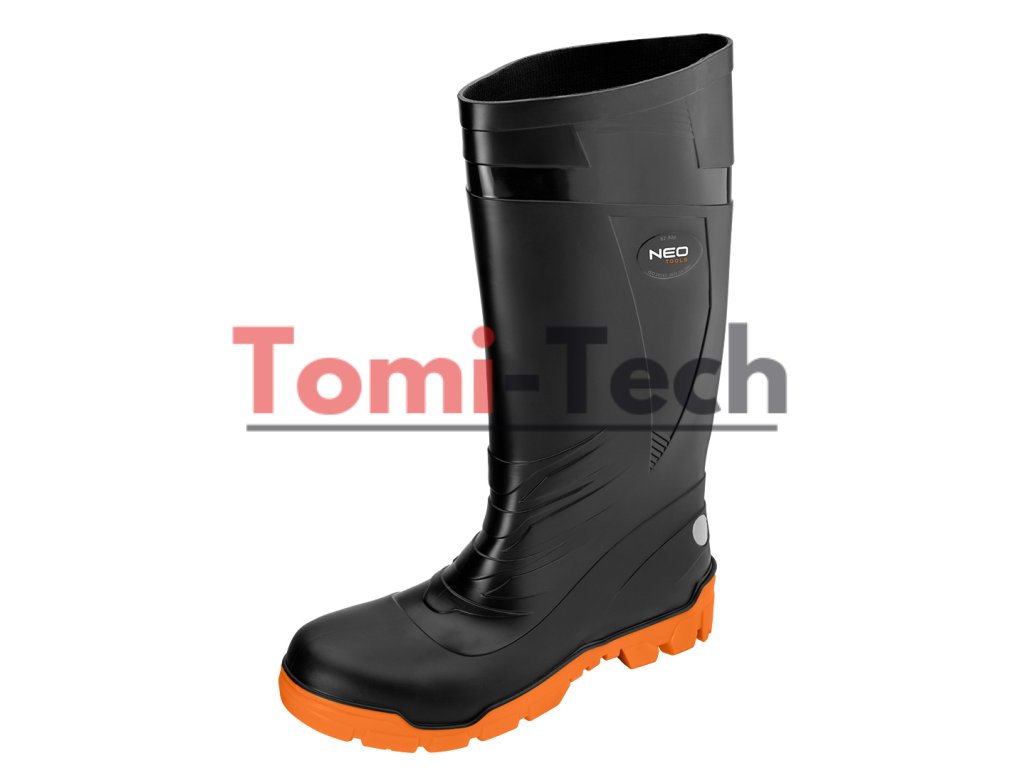 Pracovná obuv S4 SRC, veľkosť 47, PVC, polyamidová pletená podšívka, protišmyková podrážka s tlmiacim systémom, odolná voči oderu, olejom, benzínu a iným organickým rozpúšťadlám, uzavretá päta, antistatické a antibakteriálne vlastnosti vďaka použitiu prípravku Ultra Fresh, kompozitná špička, SRC - protišmyková úprava na keramických povrchoch pokrytých roztokom laurylsulfátu sodného (SLS) a na oceľových povrchoch pokrytých glycerolom, zhoda s normou EN20345Dodatočné parametre