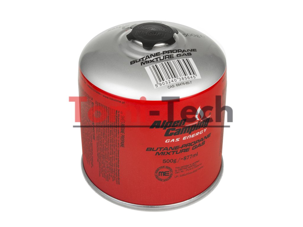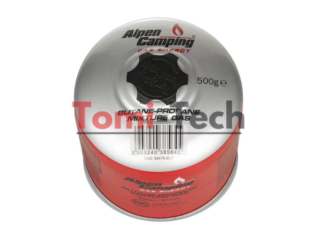 Plynová bombička Alpen Camping 500g. Certifikát: Pi 0437, zodpovedá norme EN417, propán-bután, rozsah -10°C až +40°C, závitový ventil 7/