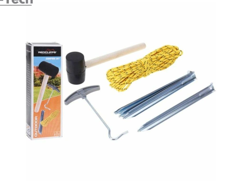 - Súprava je vybavená kladivom, 23 cm dlhými kolíkmi typu V, 20 metrovým lanom a hákom