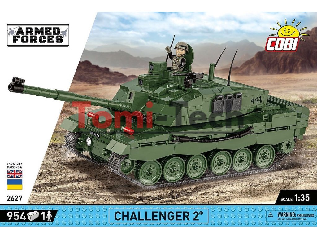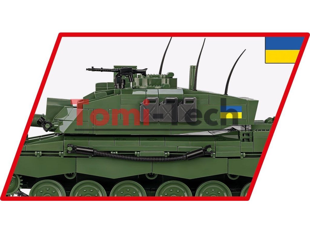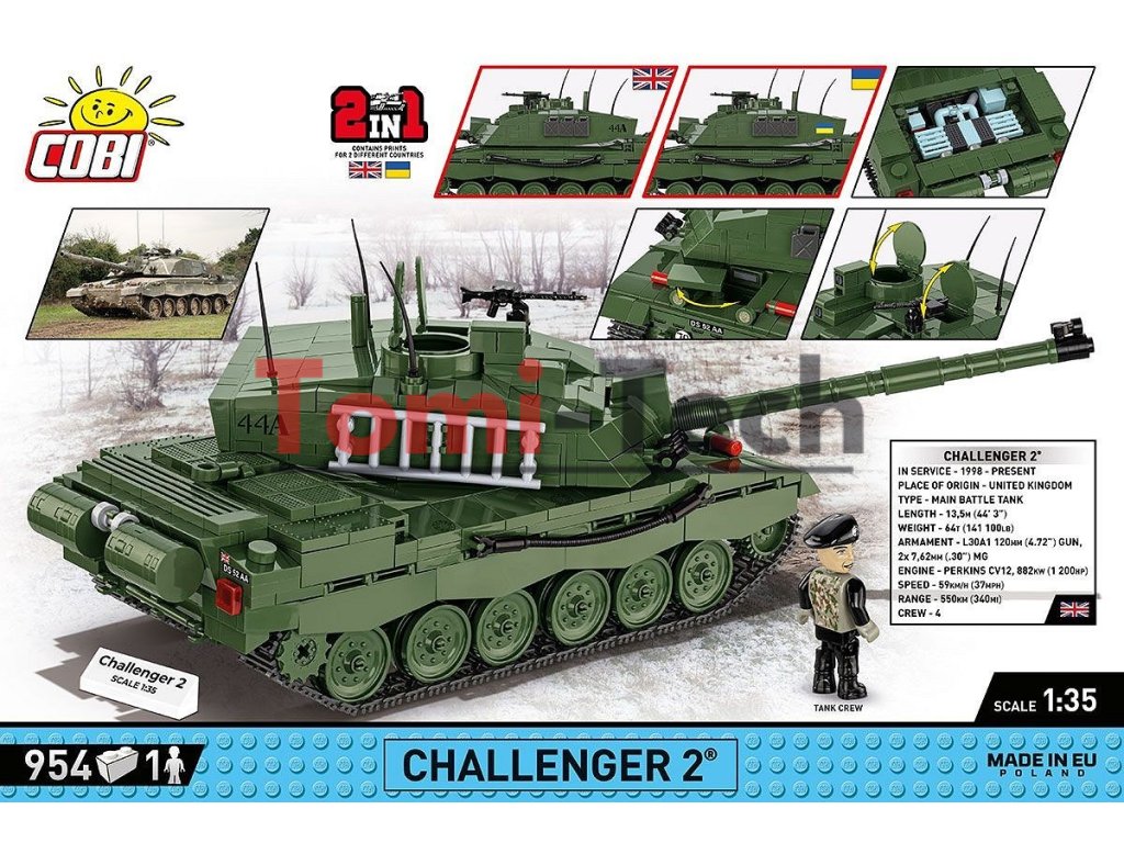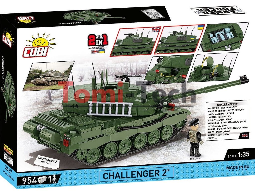 So stavebnicou COBI si môžete postaviť moderný, súčasný tank Challenger 2. Tento model vstúpil do britskej služby v roku 1998 a neustále sa vyvíja. Tanky tohto typu sú v prevádzke aj v Ománe a na Ukrajine. Model z kociek bol reprodukovaný v mierke 1:35 s použitím 954 prvkov. Tank zodpovedá rozmerom iných pozemných vozidiel vydaných ako súčasť kolekcie ozbrojených síl. Špeciálne pre tento model sme vyvinuli novú kocku v tvare veľmi charakteristickej hlavne tanku Challenger. Pod servisným poklopom sa nachádza motor z kocky. Model obsahuje pohyblivé prvky, ako sú kolesá, pásy, otočná veža a delo. Poklop veže sa otvára a možno ho použiť na umiestnenie priloženej figúrky tankistu. Figúrka sa dodáva s dvoma sadami pokrývok hlavy (prilba + baret s britským znakom). Sada obsahuje dve sady označení, z ktorých si môžete vybrať. Tento tank si môžete postaviť v ukrajinskej alebo britskej verzii.