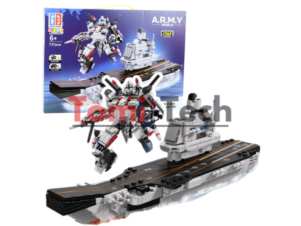 STAVEBNÉ BLOKY ROBOT LETECKEJ NOSINY 2V1> Stavebnicový lodný robot 2v1 je jedinečná súprava, ktorá vám umožní postaviť dva rôzne modely – pôsobivú lietadlovú loď a futuristického bojového robota. Tento dizajn 2 v 1 robí hru ešte kreatívnejšou a rozmanitejšou a umožňuje deťom rozvíjať ich manuálne zručnosti, priestorovú predstavivosť a logické myslenie. Lietatová loď zaujme svojimi detailmi – od verne reprodukovanej letovej paluby až po stožiar a veliteľskú vežu. Robot má zase pohyblivé časti, čo vám umožňuje pózovať v dynamických pózach a vytvárať si vlastné herné scenáre. Vďaka veľkému množstvu prvkov môžete vytvárať zložité štruktúry, ktoré zaberú na celé hodiny. Súprava je vyrobená z vysoko kvalitného plastu, ktorý zaisťuje odolnosť a bezpečnosť používania. Je to perfektná voľba pre deti, ktoré milujú stavanie, a skvelý nápad na darček pre nadšencov vojenskej a robotickej techniky. ŠPECIFIKÁCIA: