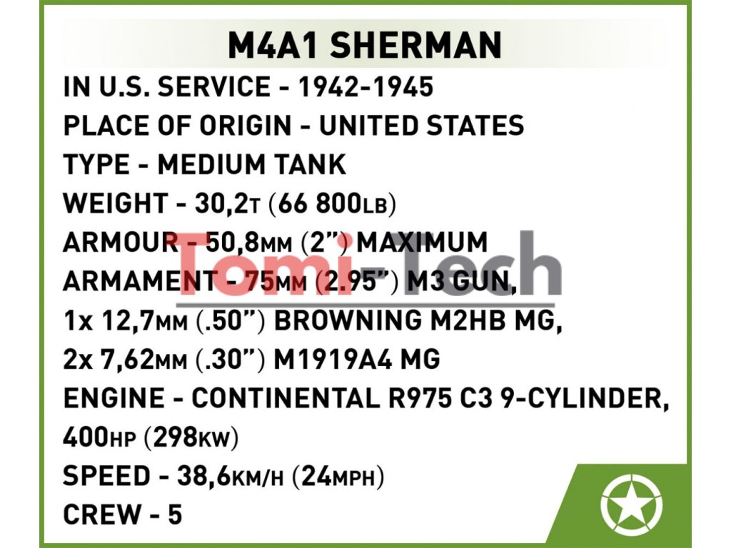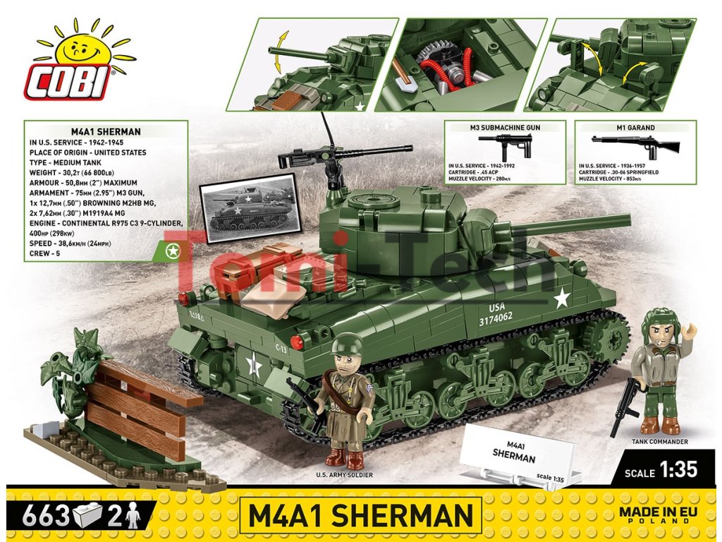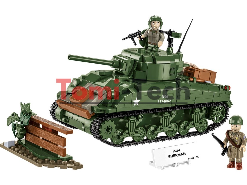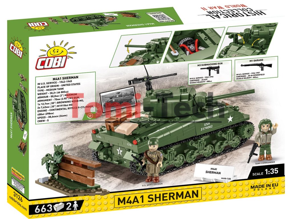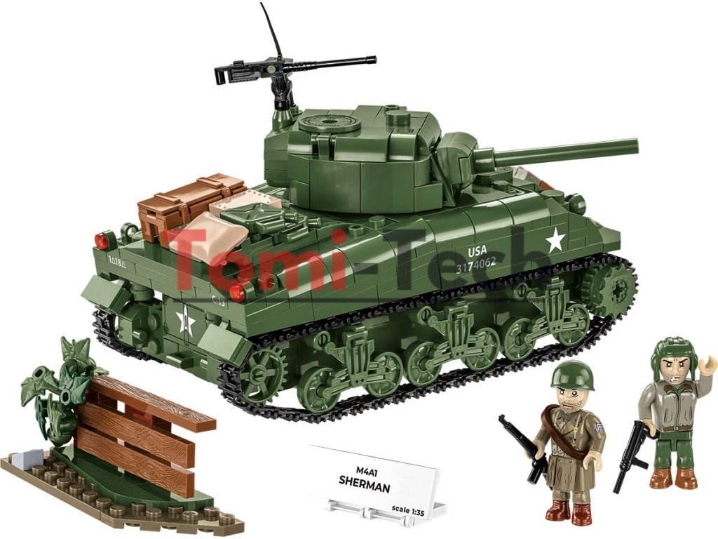 Sherman postavený z kociek bol starostlivo navrhnutý v mierke 1:35 s použitím 663 dielov. Tank má funkčné pásy, otočnú vežu, pohyblivú hlaveň, otvárateľný poklop a servisný poklop s motorom postaveným z kociek pod ním. Súprava obsahuje figúrku amerického tankistu s prilbou a samopalom M3 „Greaser“. Druhá figúrka zobrazuje pešiaka oblečeného v hrubom kabáte a ozbrojeného puškou M1 Garand. Kocky obsahujú vysoko kvalitné potlače, ktoré odrážajú označenie a detaily tanku, ako aj detaily uniformy veliteľa tanku a pešiaka. Sada obsahuje aj prvky prostredia: časť plota a živý plot. Táto sada bola starostlivo vyrobená a je perfektným rozšírením obľúbenej série Historical Collection! Fanúšikovia histórie a stavebných kociek si tu nájdu niečo pre seba!