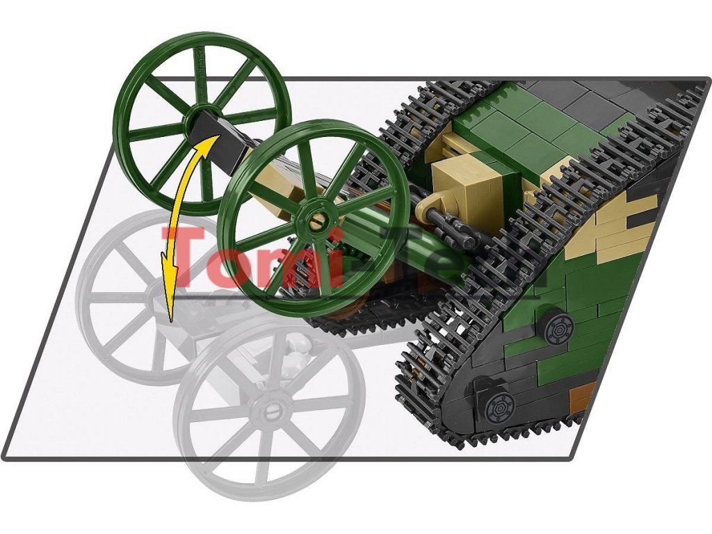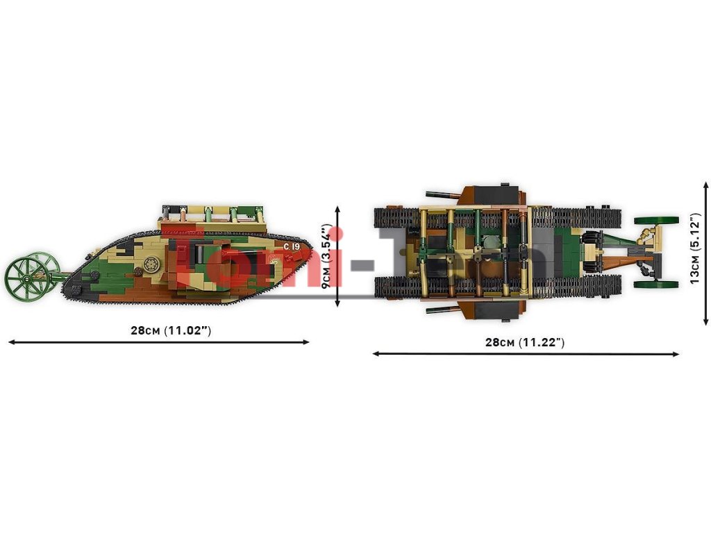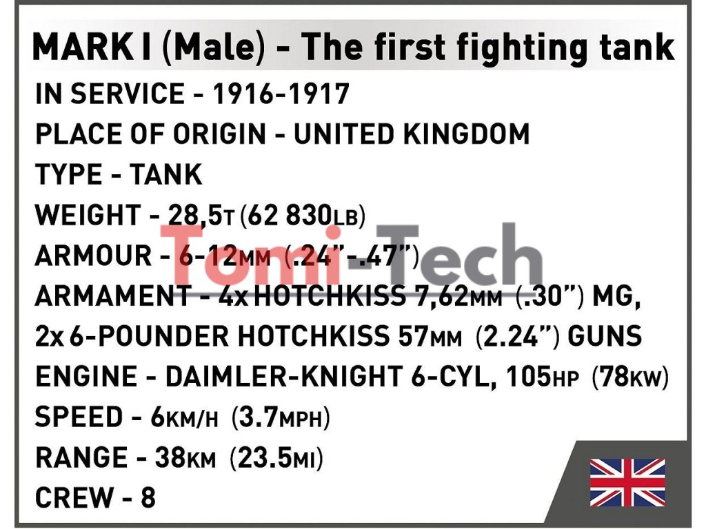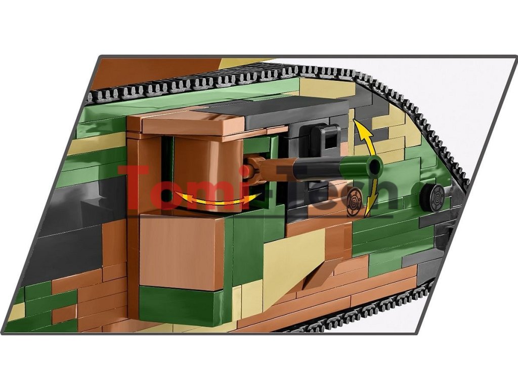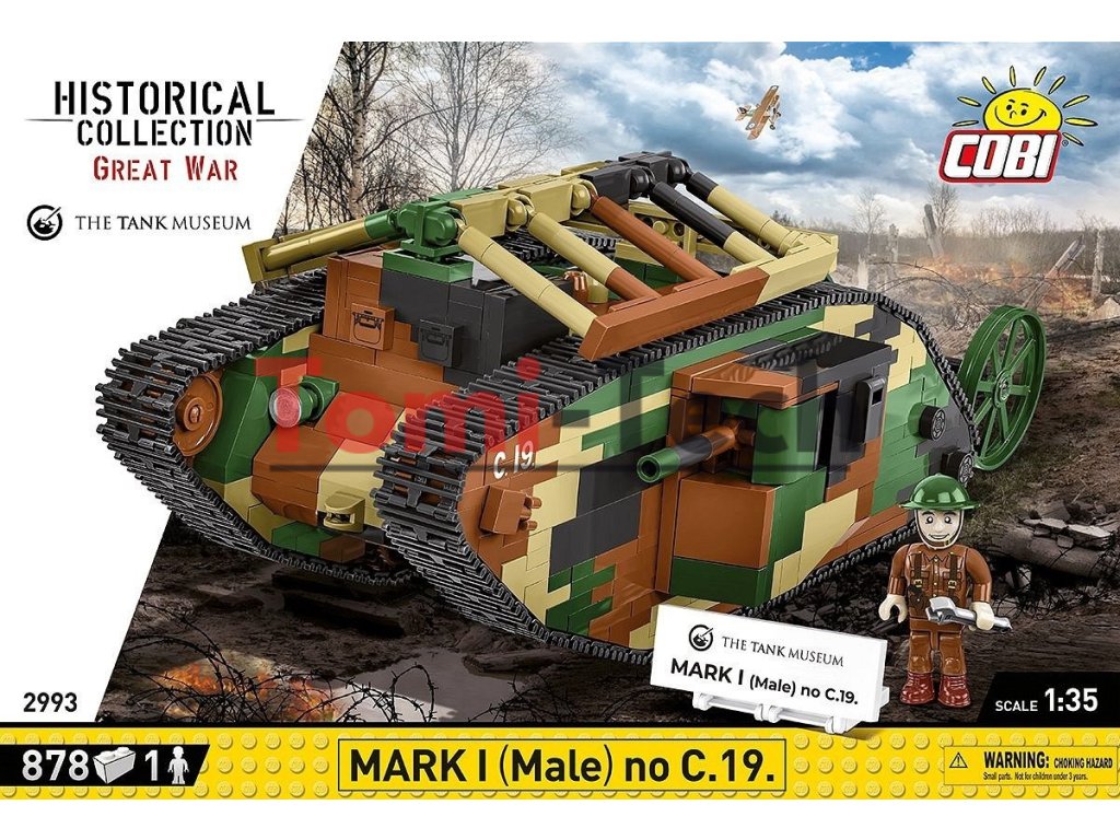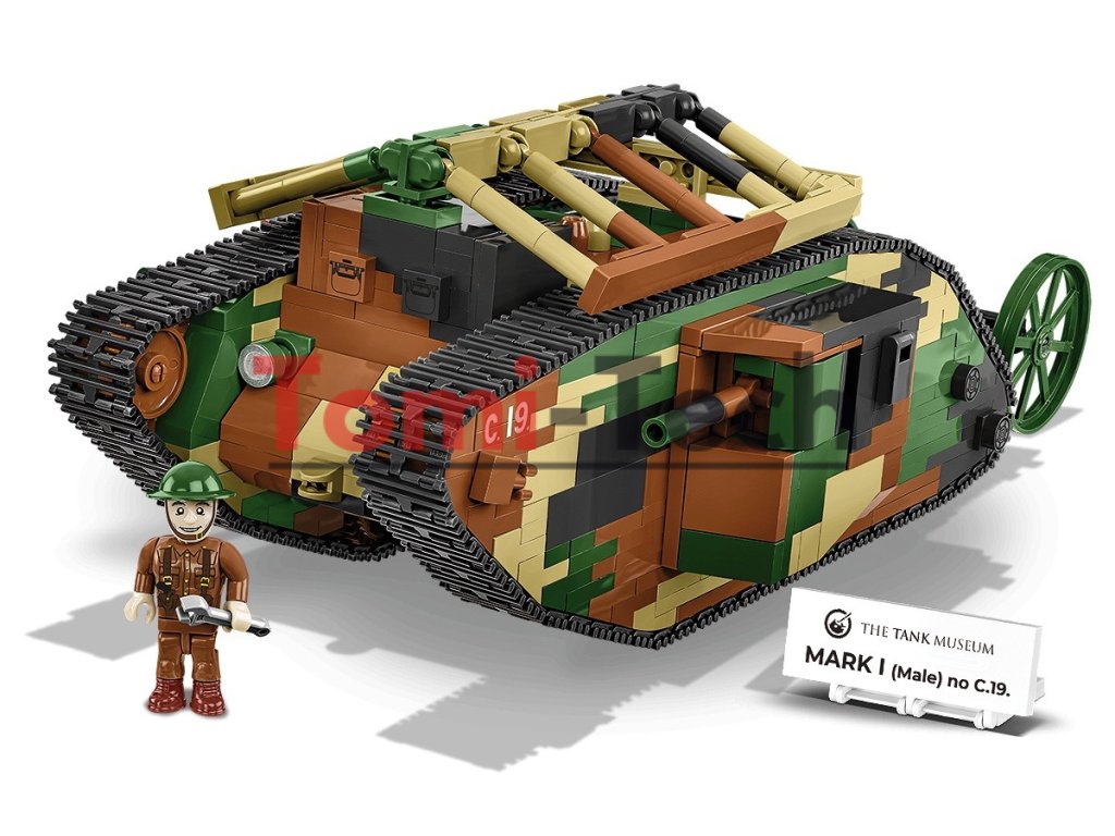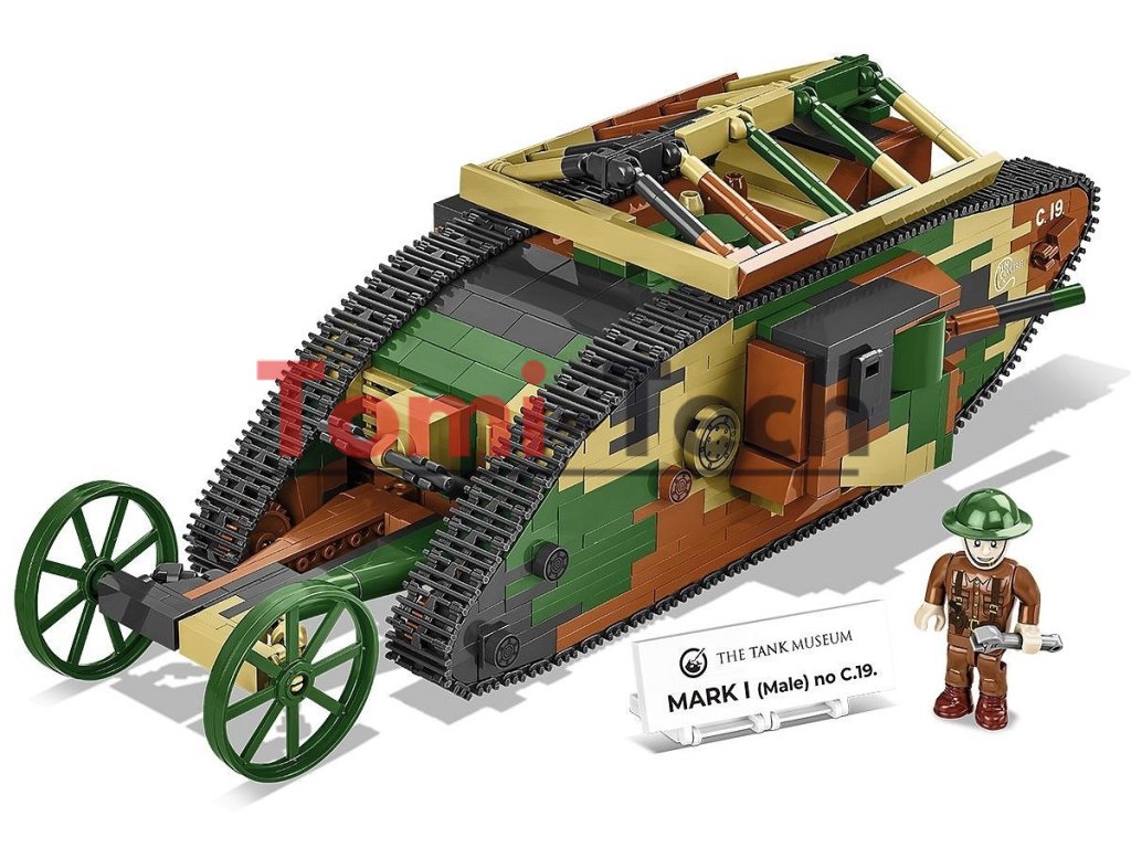 Britský tank Mark I (mužská verzia) bol vyrobený v roku 1916 počas prvej svetovej vojny. Bol to jeden z prvých tankov použitých vo vojenskej histórii. Prípona „male“ v názve označovala, že išlo o variant tanku vybavený kombináciou kanónov umiestnených vo vežiach po bokoch vozidla a guľometov. Ženské verzie tohto typu tanku boli vybavené viacerými guľometmi. Vozidlo bolo poháňané benzínovým motorom, ktorý mu umožňoval dosahovať rýchlosť až 6,4 km/h. Bol pomalý a objemný, ale jeho pancier poskytoval určitú ochranu pred nepriateľskými ručnými zbraňami. Tank Mark I (Male), č. C.19, bol prvýkrát použitý v boji v roku 1916 počas bitky na Somme počas prvej svetovej vojny. Jeho hlavným účelom bolo prelomiť nepriateľské opevnenia, ničiť ostnaté drôty a podporovať pechotu pri dobývaní pozícií. Hoci to nebolo dokonalé bojové vozidlo, jeho prítomnosť na bojisku zohrala významnú úlohu vo vývoji vojnovej stratégie. Tank Mark I je nevyhnutnosťou pre nadšencov histórie a obrnených vozidiel a krásnym modelom do zbierky z čias prvej svetovej vojny. Stavajte históriu, tehličku po tehličke!