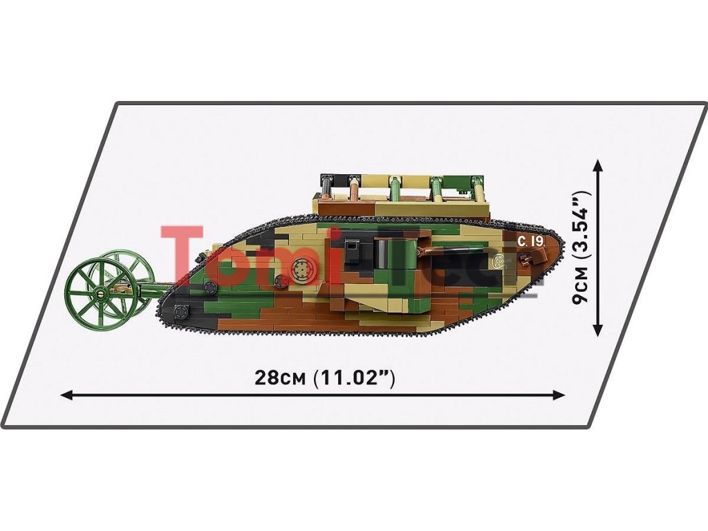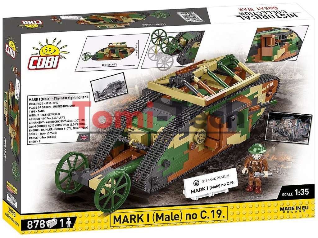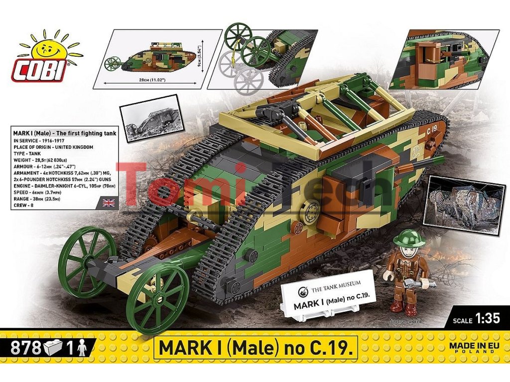 Prvá svetová vojna priniesla éru oceľových slonov, ktorá trvá dodnes. Vtedy sa zrodil dizajn jedného z prvých tankov! MARK I (mužská verzia) číslo C.19. Môžete ho postaviť z 878 stavebných kociek COBI. Model meria 28 cm na dĺžku. Vďaka mierke 1:35 je model vhodný pre figúrky COBI a ďalšie vozidlá uvedené na trh v tejto veľkosti. Tank je vybavený funkčným pásovým pohonom, otočnými delami a otváracími poklopmi. Značky a emblémy sú vyrobené z farebných kociek a odolných potlačí, ktoré sa neopotrebujú ani pri intenzívnom používaní. Sada obsahuje figúrku britského tankistu z obdobia prvej svetovej vojny a plaketu s názvom sady a logom Tankového múzea, v ktorom sa nachádza pôvodný tank, na ktorom sme založili náš dizajn pre túto sadu.
