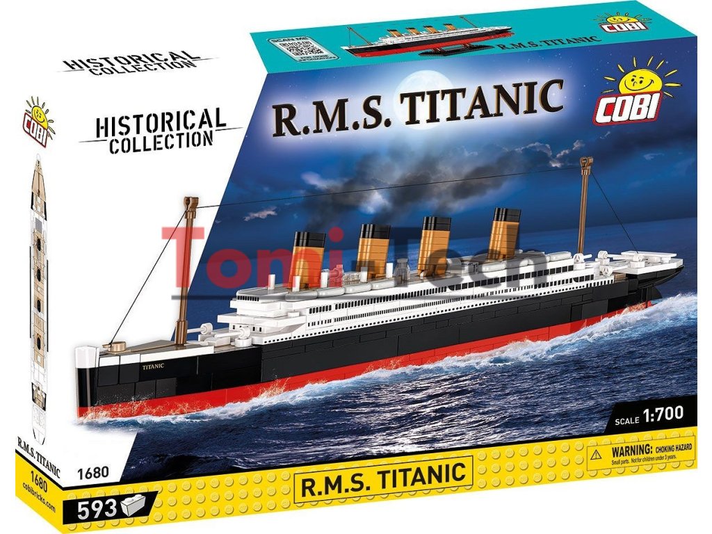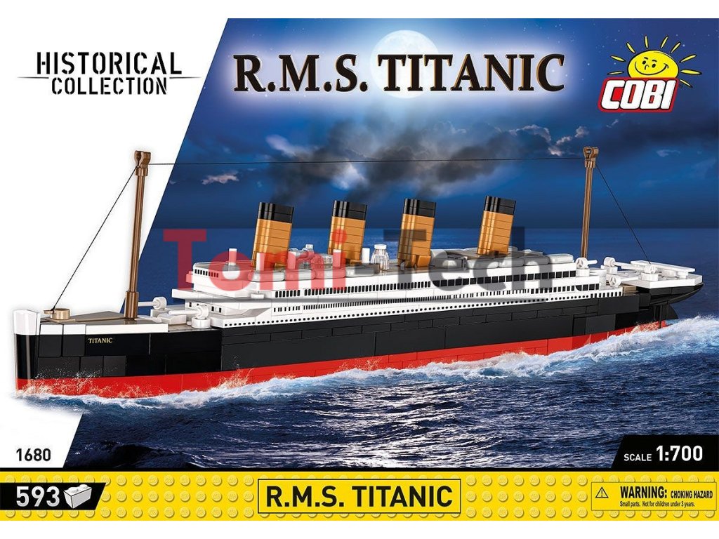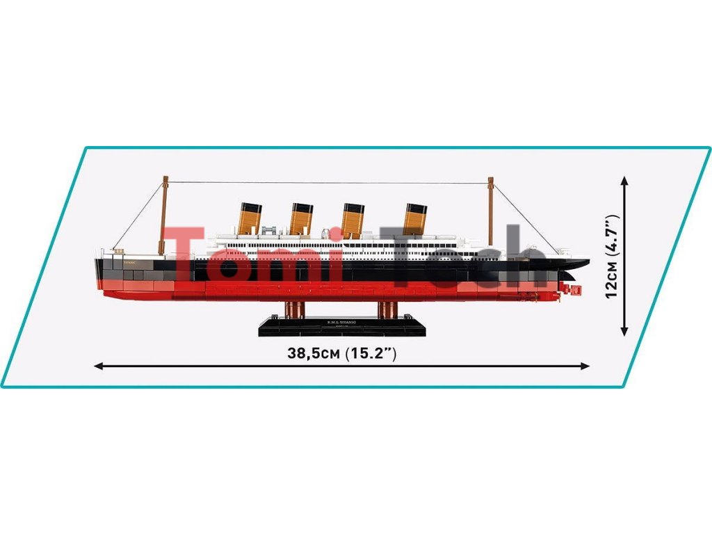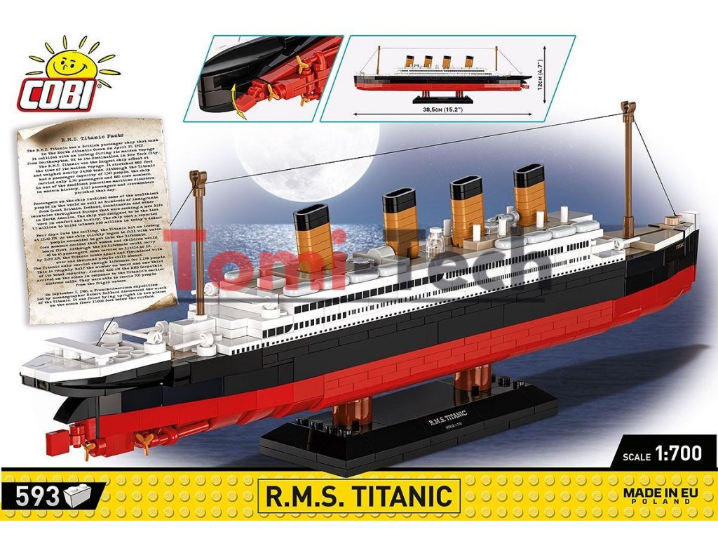 Model, postavený z 593 stavebných kociek COBI, meria 38,5 cm na dĺžku a 12 cm na výšku v mierke 1:700. Presne reprodukuje tvar a telo Titanicu, zatiaľ čo početné detaily, ako sú pohyblivé žeriavy, vrtule a kormidlo, zabezpečujú autenticitu a možnosť interakcie. Súčasťou sady je aj elegantný stojan s plaketou, vďaka čomu je ideálna na vystavenie v akomkoľvek interiéri.