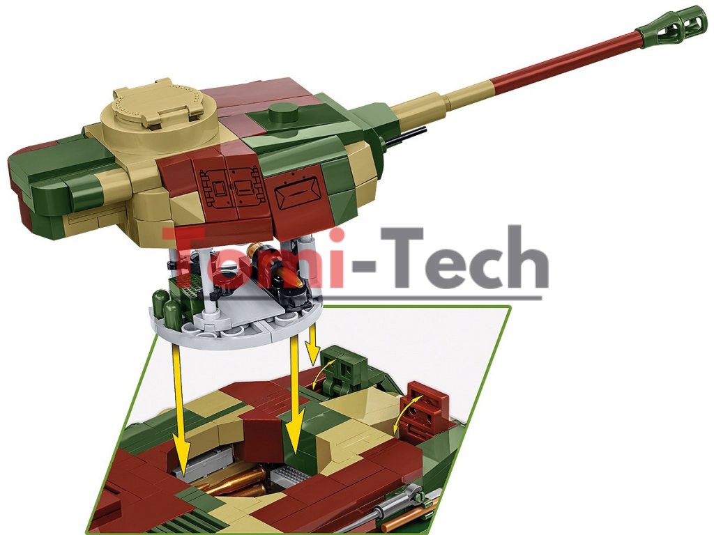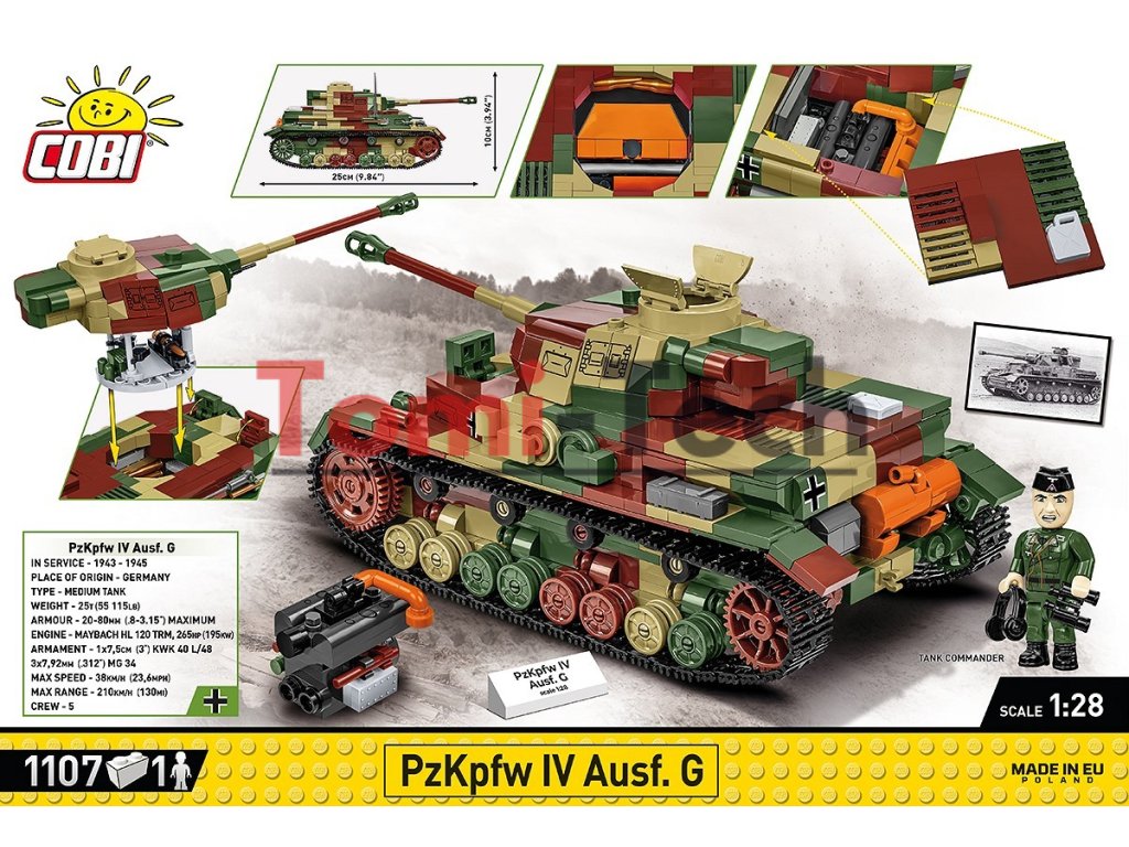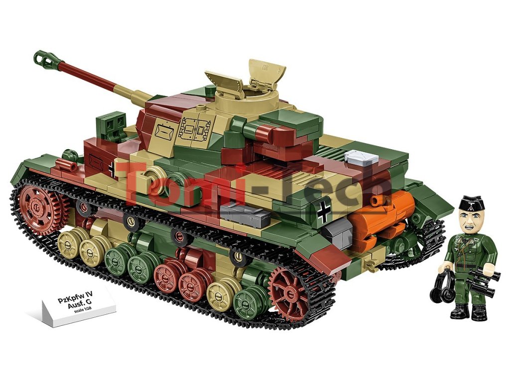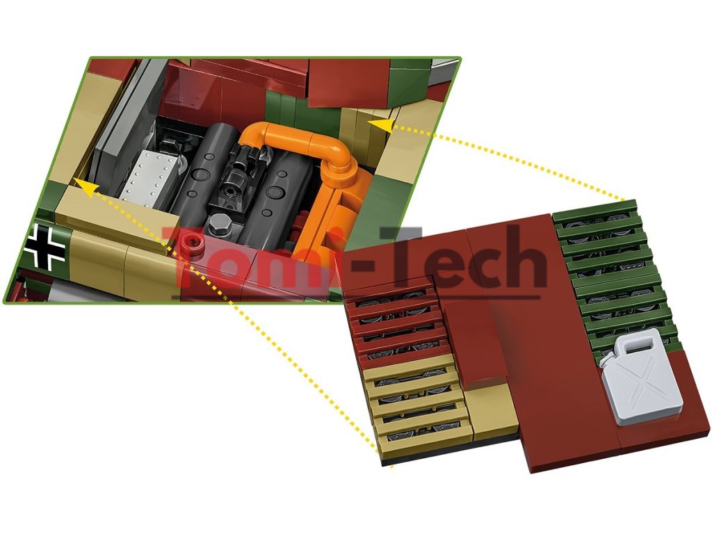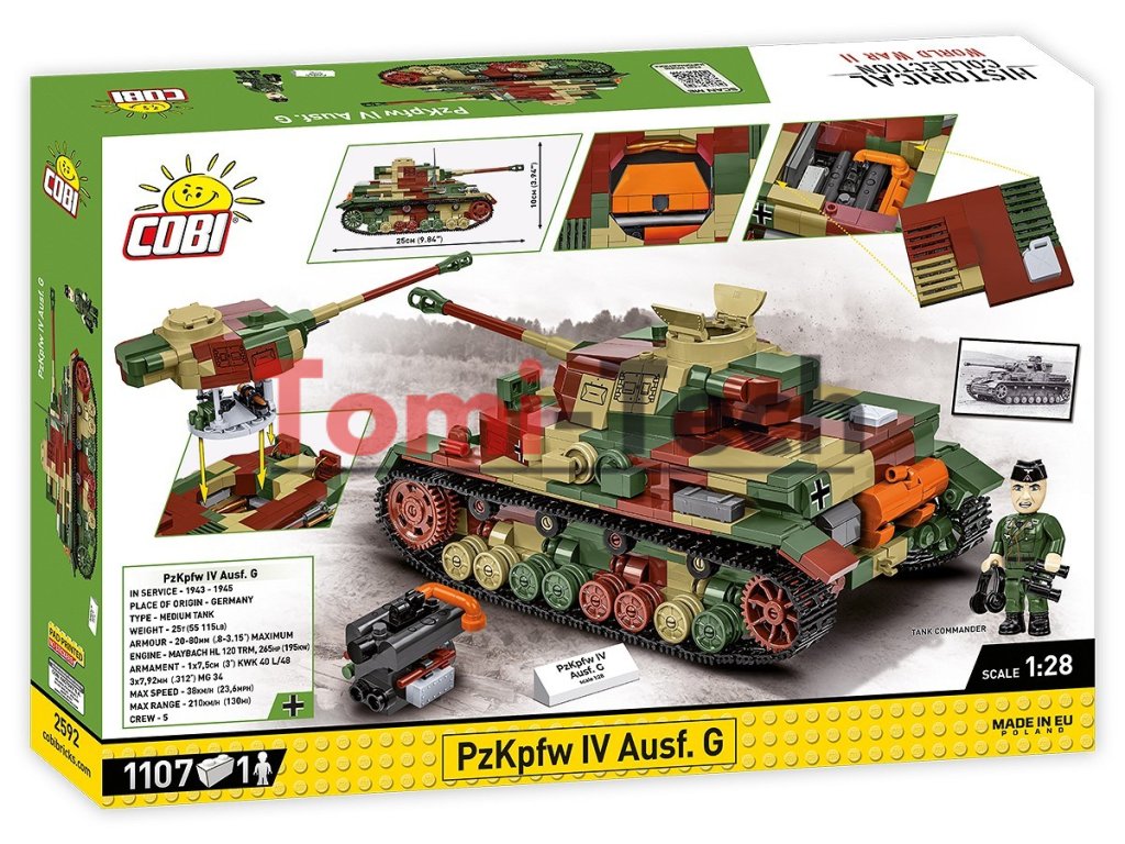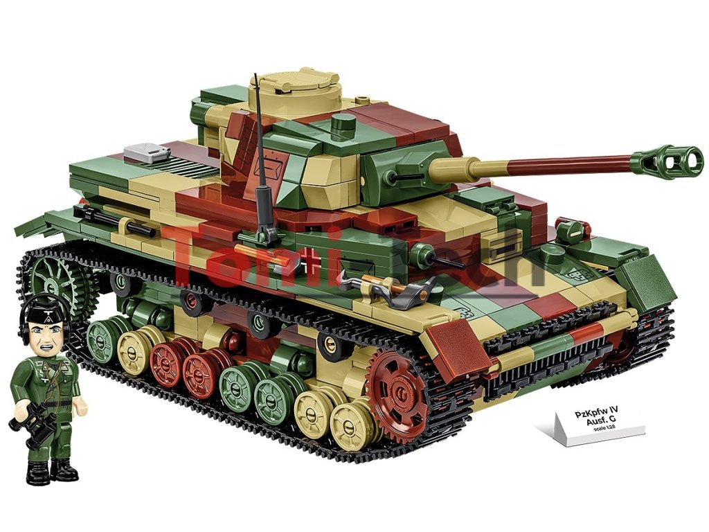 Tank Panzerkampfwagen IV bol jedným z najdôležitejších nemeckých tankov počas druhej svetovej vojny. Pazner IV postavený z kociek sa skladá z 1107 dielikov a je navrhnutý v mierke 1:28. Kocky majú vysoko kvalitné potlače, ktoré sa počas hry nezmiznú. Farebná kamufláž je charakteristická pre posledné obdobie vojny. Model má otvárací poklop, do ktorého je možné umiestniť figúrku tankistu. Veža sa otáča o 360 stupňov a hlaveň dela sa dá pohybovať hore a dole. Veža a kôš sa dajú od stavebnice oddeliť, čo vám umožní obdivovať interiér vozidla. Pod servisným poklopom sa nachádza motor postavený z kociek, ktorý je možné vystaviť aj vedľa modelu. Trakcia pásov funguje, keď sa tank pohybuje ručne. Súprava obsahuje figúrku vodiča tanku s bočnou čiapkou a slúchadlami, ako aj plaketu s vytlačeným názvom vozidla. Postavte si tento historický tank Panzer IV z druhej svetovej vojny a objavte neuveriteľné detaily!