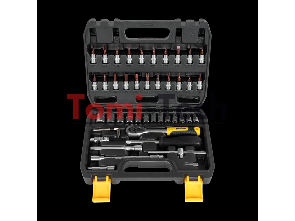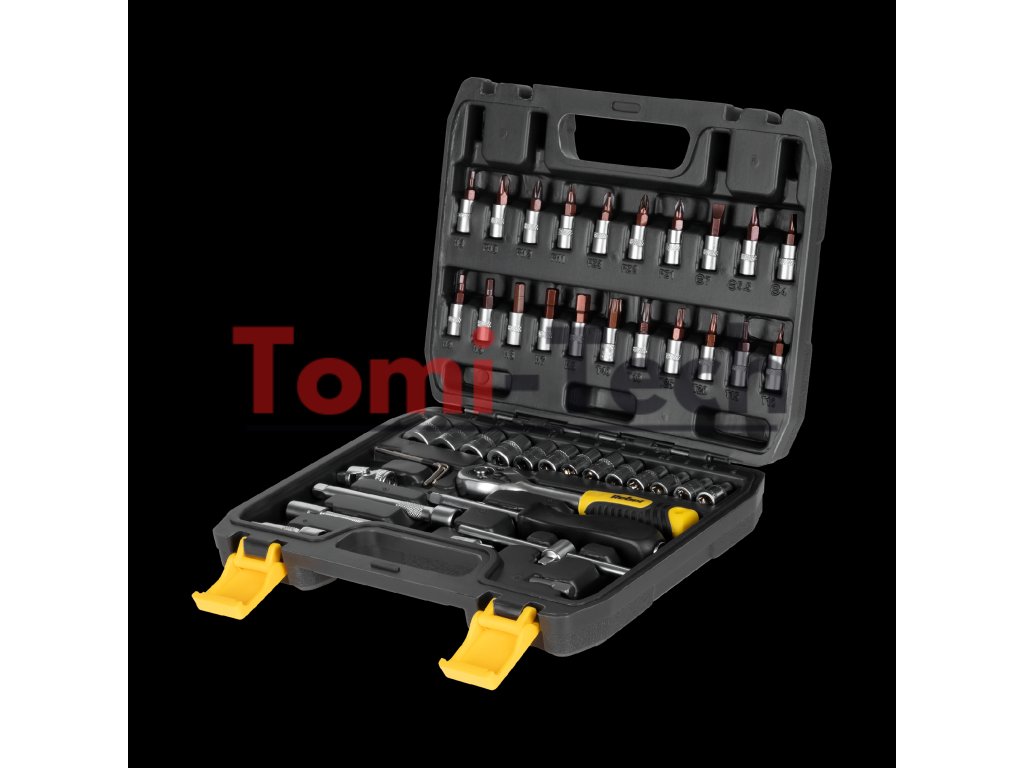 Pogumovaná rukoväť s račňou umožňuje výnimočne pohodlné používanie nástroja, a to aj pri dlhodobom používaní. Súprava obsahuje širokú škálu nástrčných kľúčov, kľúčov a predĺžení, ktoré zaisťujú všestrannosť v rôznych aplikáciách.