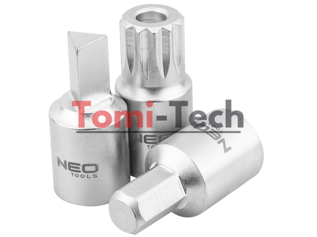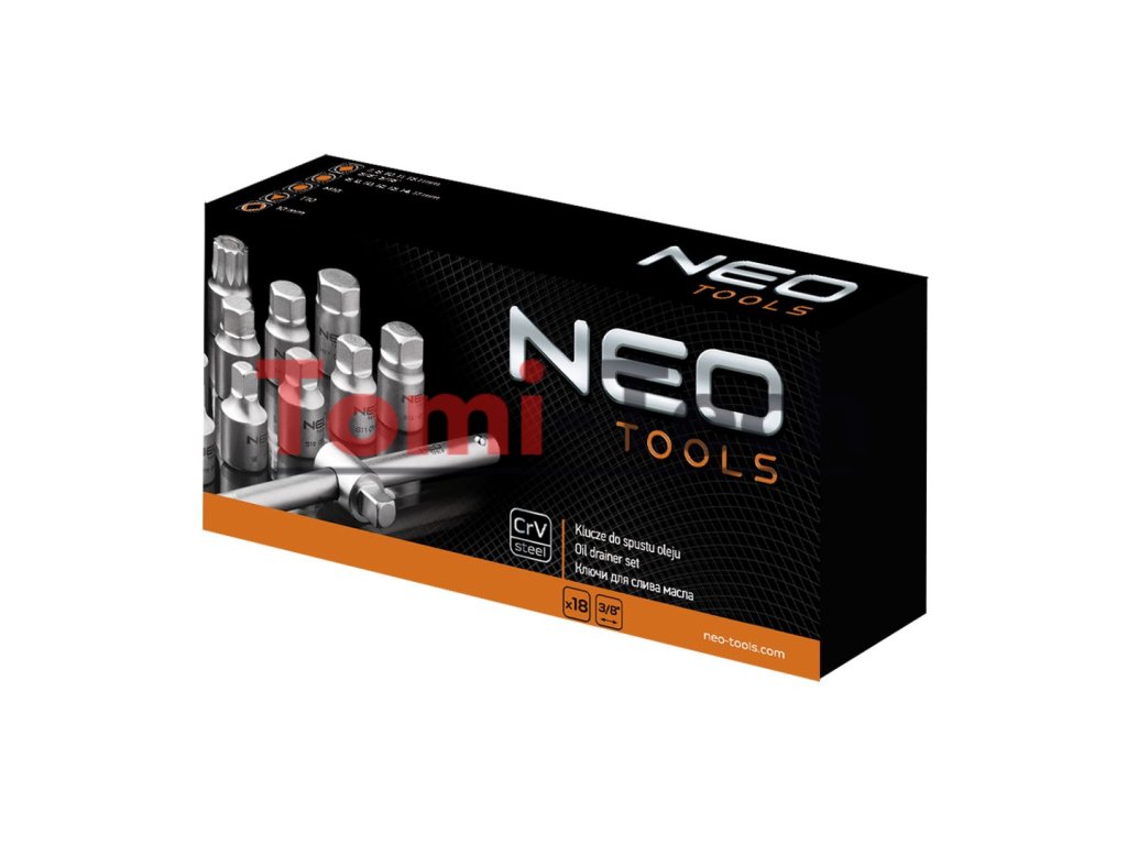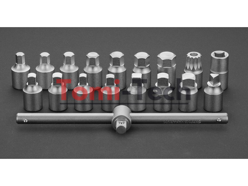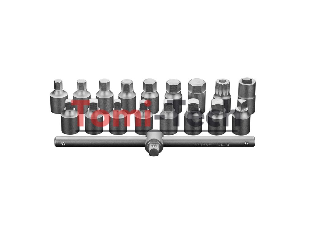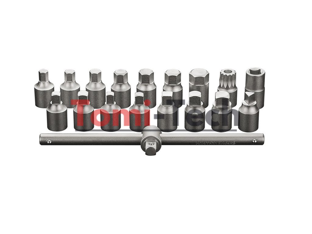 3/8" kľúče na vypúšťanie oleja, sada 18 ks. 3/8" priechodný kľúč s gombíkom, 7 šesťhranných objímok (Hex) - samec: 8, 9, 10, 12, 13,1, 14, 17 mm, 7 ks štvorcových - samec: 7, 8, 10, 11, 13,1 mm, 5, 16, 3, 8, štvorcových - samica: 10 mm, trojuholníkových - samec: 10 mm, drážkových s otvorom (ochrana proti neoprávnenej manipulácii) M16, certifikát TÜV M+T.Dodatočné parametre