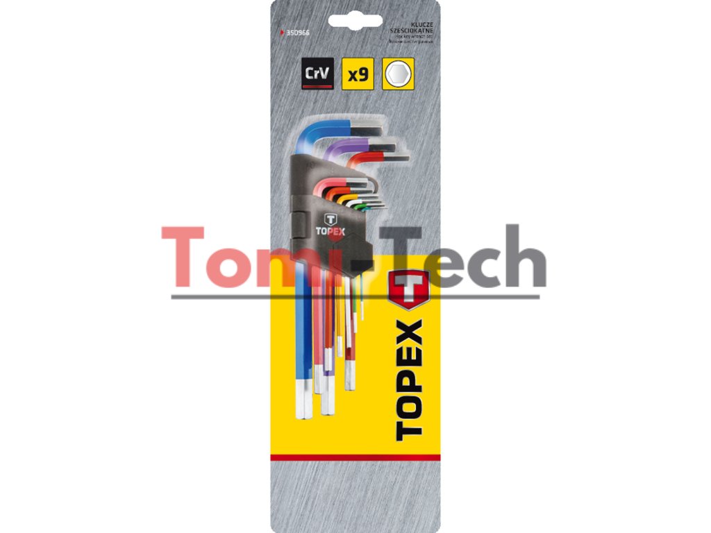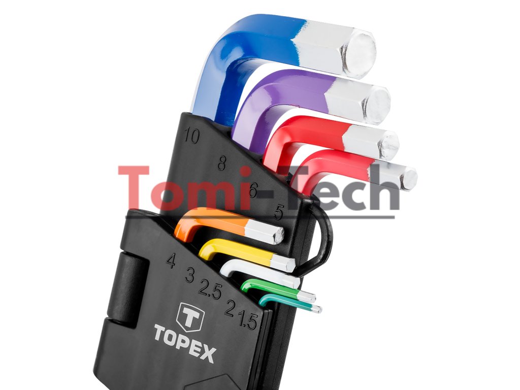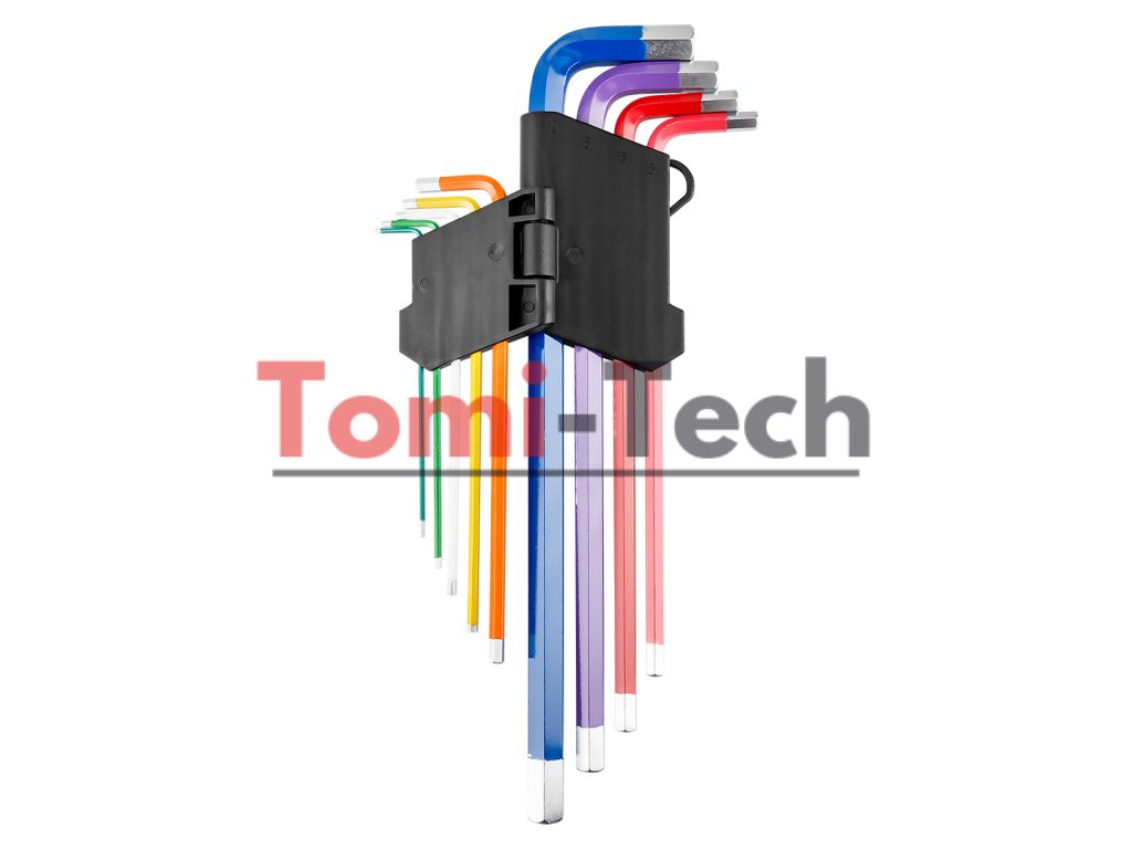 Šesťhranné kľúče 1,5 - 10 mm, sada 9 kusov, s držiakom, oceľ CrV, veľkosti: 1,5, 2, 2,5, 3, 4, 5, 6, 8, 10 mm, farebne odlíšené veľkostiDodatočné parametre