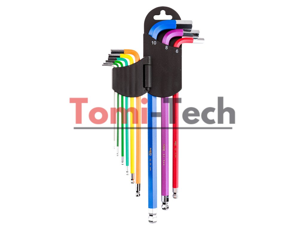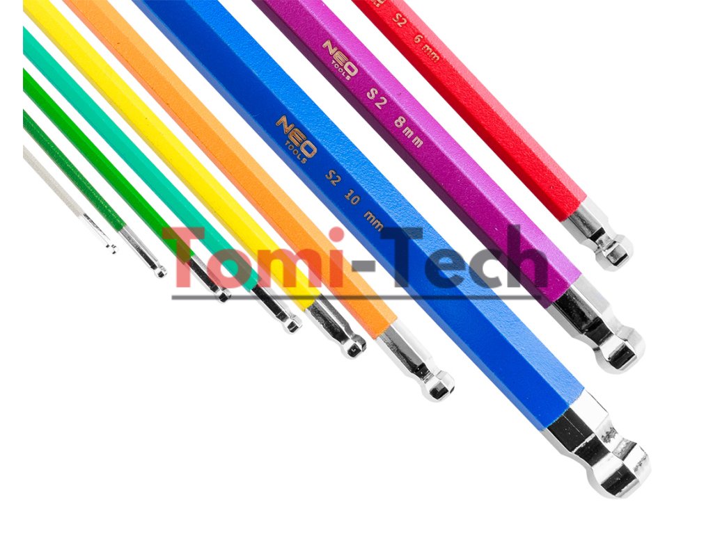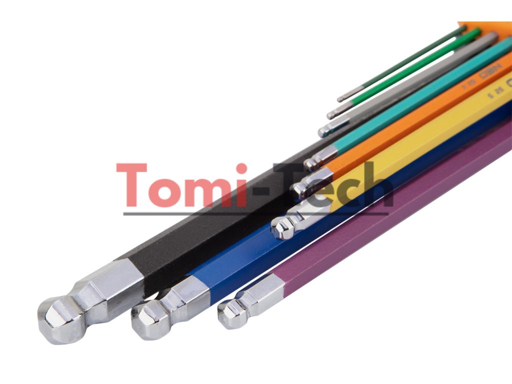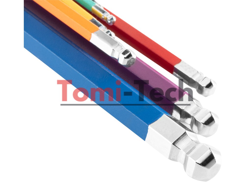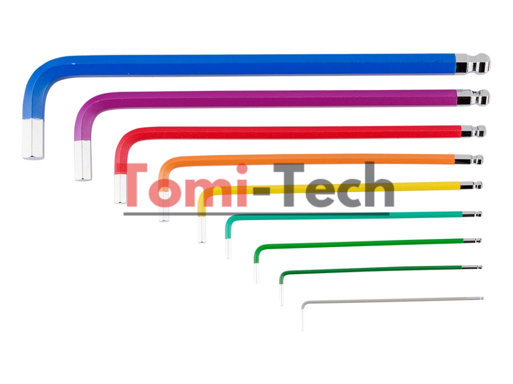 Šesťhranné kľúče 1,5 – 10 mm, 9-dielna sada, guľové hlavy s pracovným uhlom 30°, oceľ S2, farebné kódovanie pre jednoduchý výber veľkosti, DIN911, ISO2936, veľkosti: 1,5, 2, 2,5, 3, 4, 5, 6, 8, 10 mm, certifikované TÜV M+T, 25-ročná zárukaDodatočné parametre