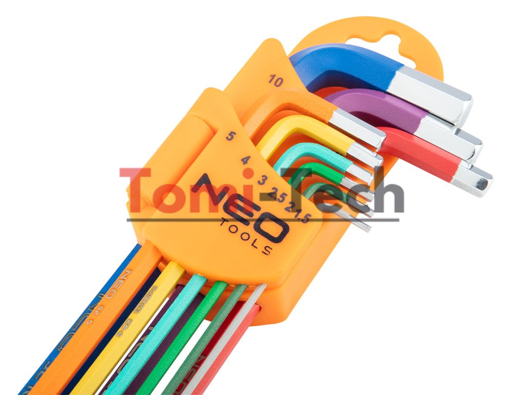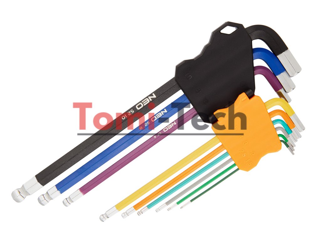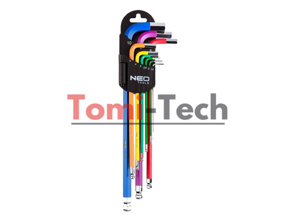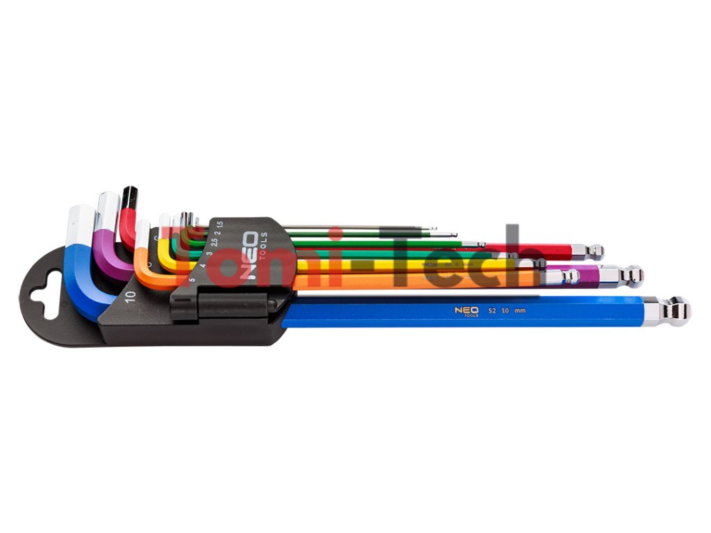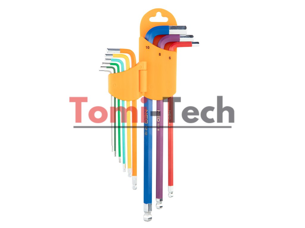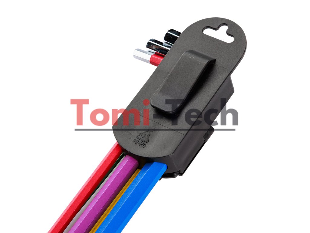 Šesťhranné kľúče 1,5 – 10 mm, 9-dielna sada, guľové hlavy s pracovným uhlom 30°, oceľ S2, farebné kódovanie pre jednoduchý výber veľkosti, DIN911, ISO2936, veľkosti: 1,5, 2, 2,5, 3, 4, 5, 6, 8, 10 mm, certifikované TÜV M+T, 25-ročná zárukaDodatočné parametre