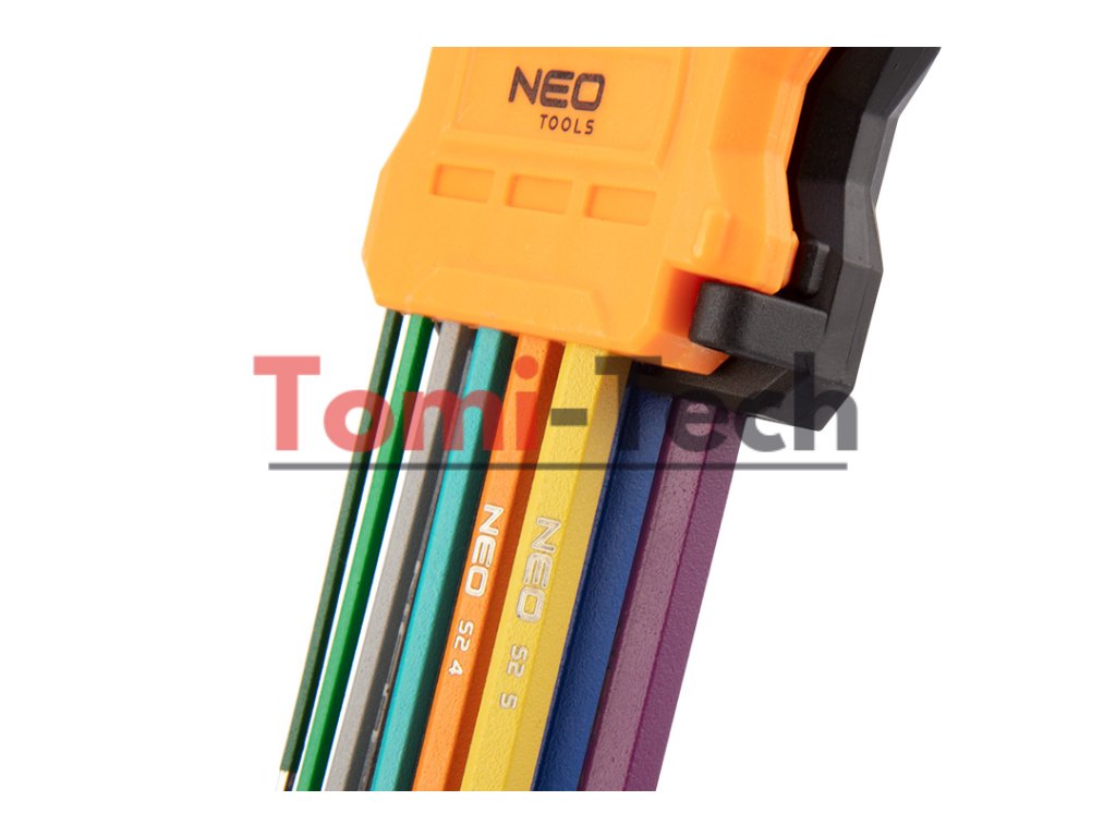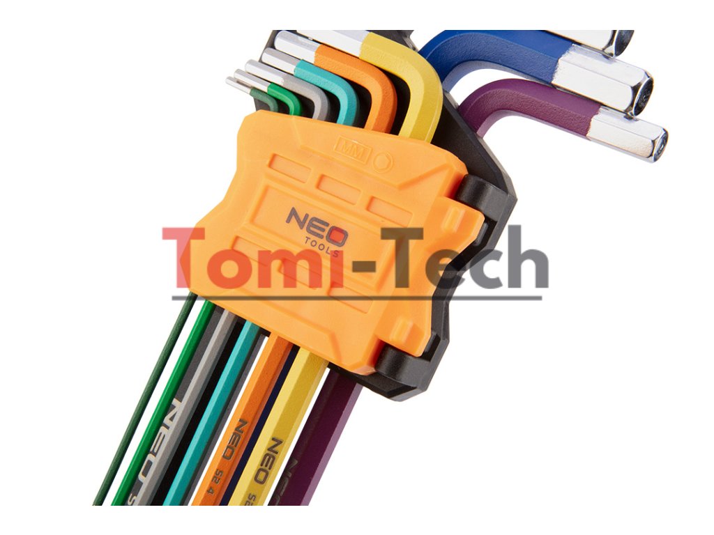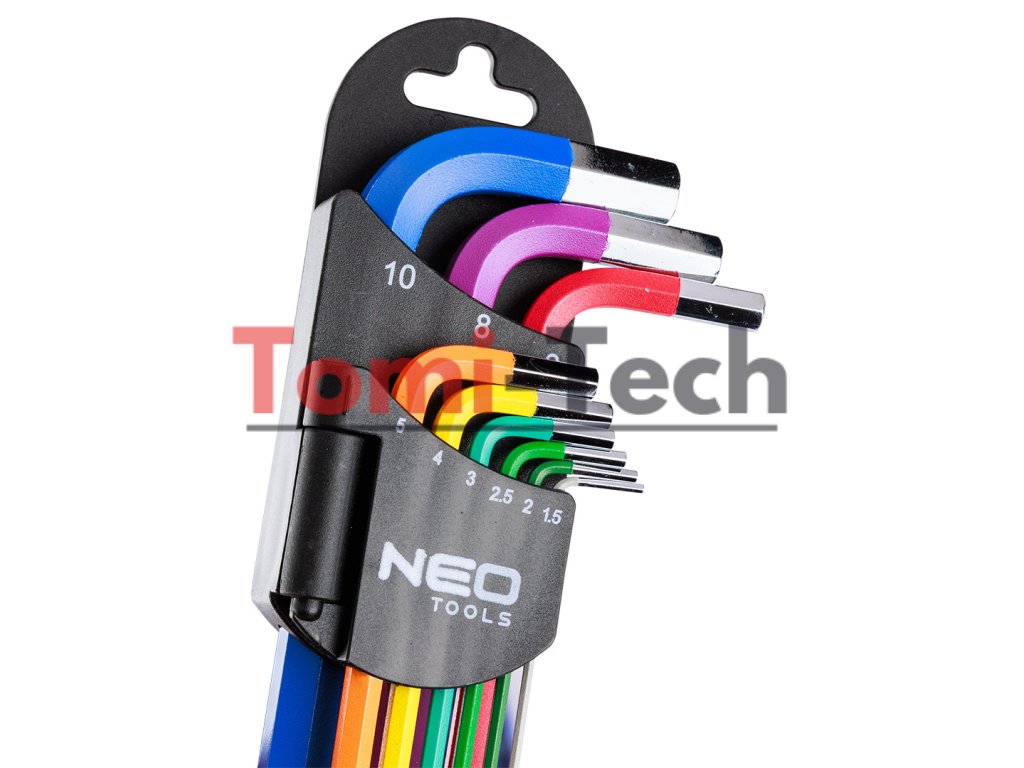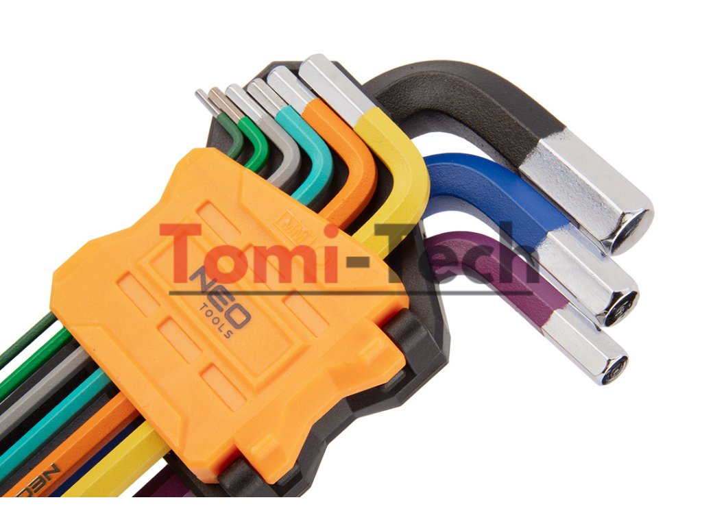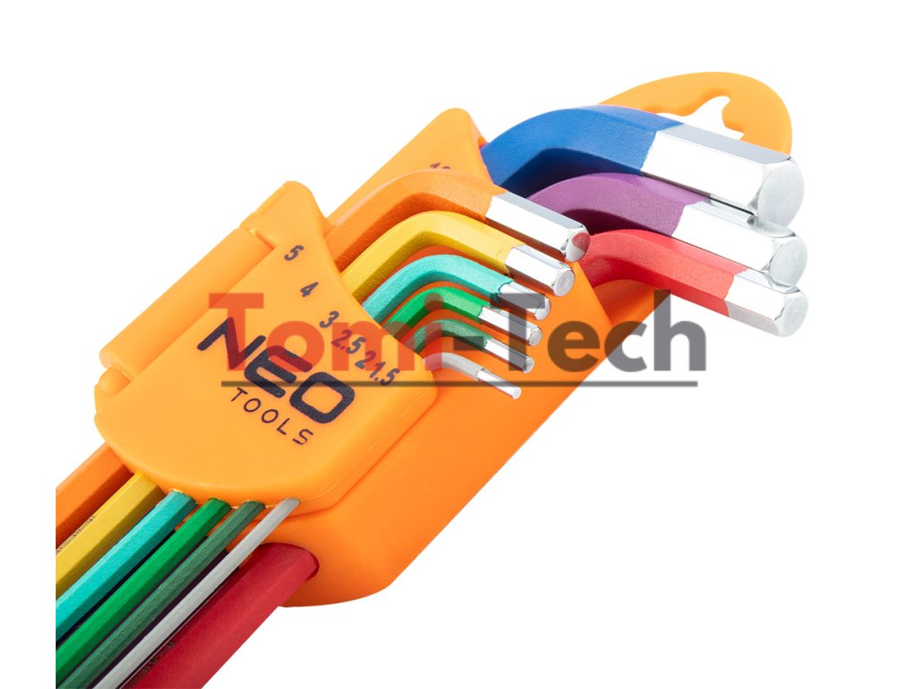 Šesťhranné kľúče 1,5 – 10 mm, 9-dielna sada, guľové hlavy s pracovným uhlom 30°, oceľ S2, farebné kódovanie pre jednoduchý výber veľkosti, DIN911, ISO2936, veľkosti: 1,5, 2, 2,5, 3, 4, 5, 6, 8, 10 mm, certifikované TÜV M+T, 25-ročná zárukaDodatočné parametre