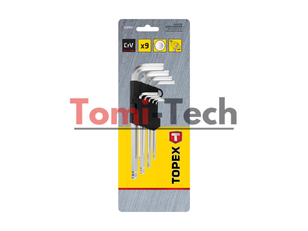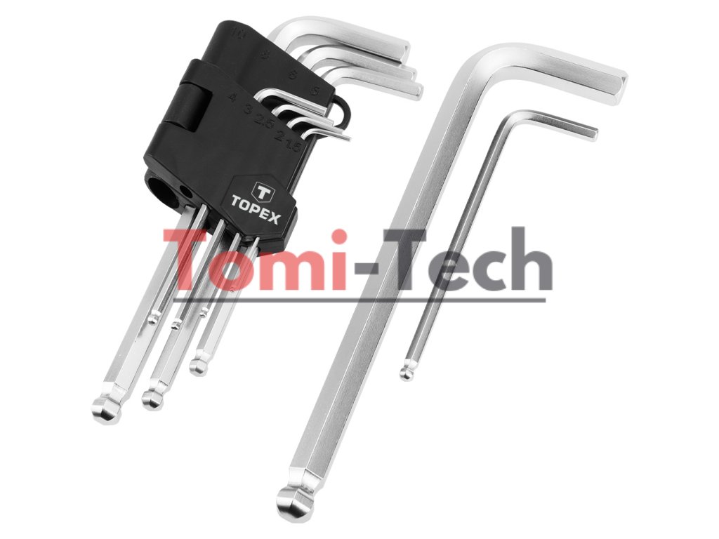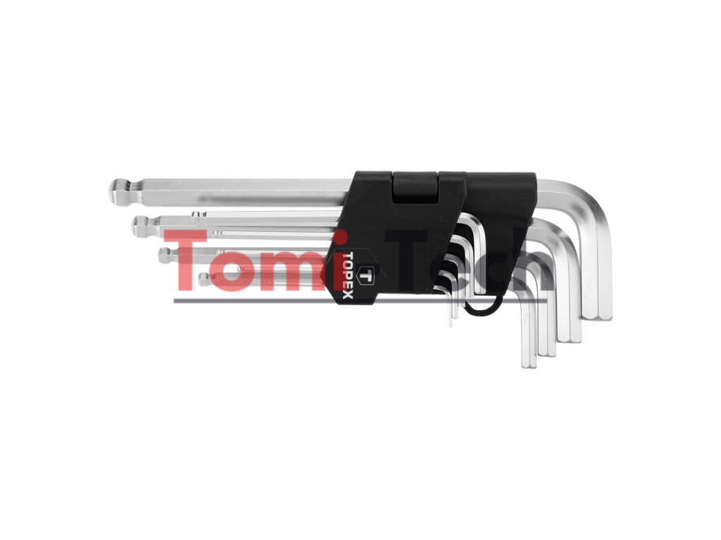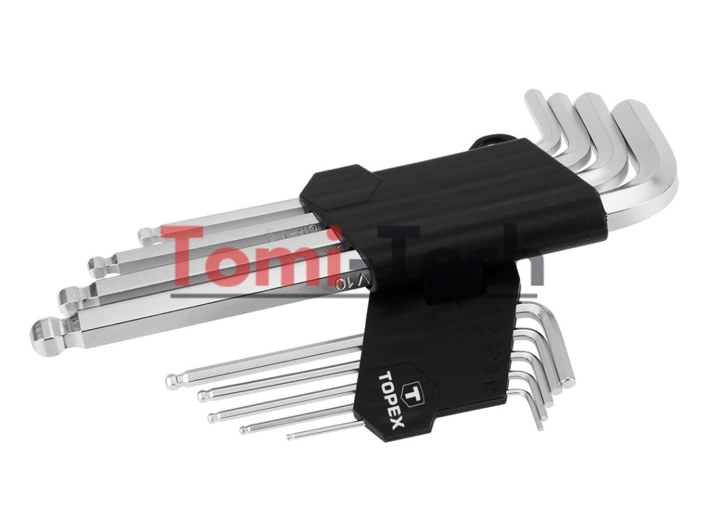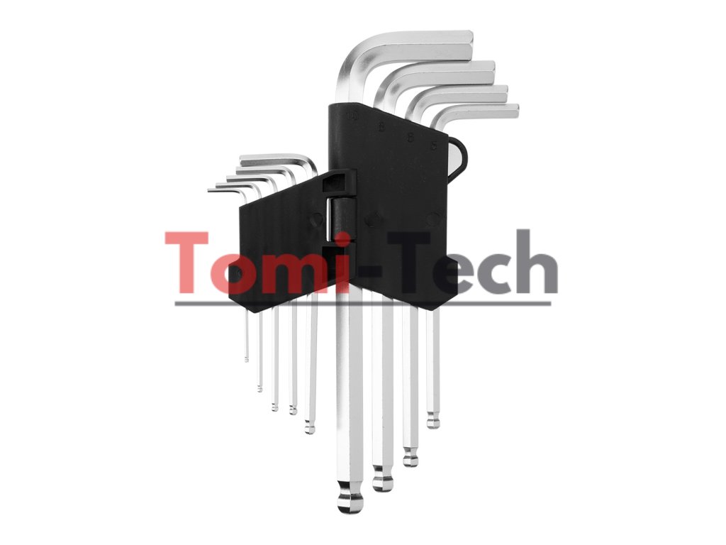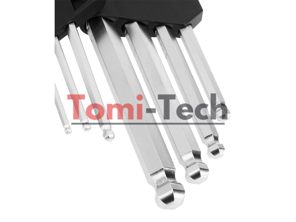 Šesťhranné kľúče 1,5 – 10 mm, sada 9 kusov, dlhé, guľové konce s pracovným uhlom 30°, oceľ CrV, veľkosti: 1,5, 2, 2,5, 3, 4, 5, 6, 8, 10 mmDodatočné parametre
