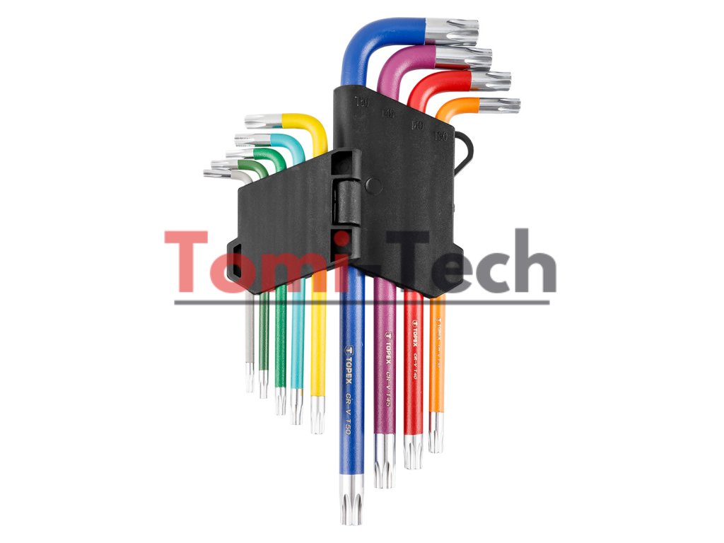 Kľúče Torx T10-T50, 9-dielna sada, oceľ CrV, veľkosti: T10, T15, T20, T25, T27, T30, T40, T45, T50, farebne odlíšené veľkostiDodatočné parametre
