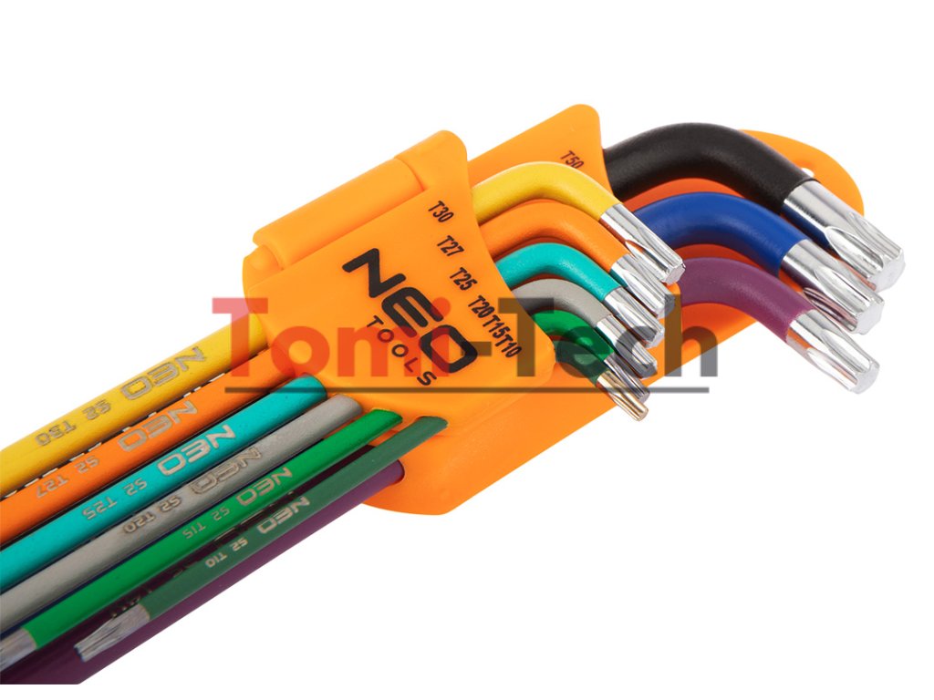 Kľúče Torx T10-T50, 9-dielna sada, oceľ S2, farebné kódovanie pre jednoduchý výber veľkosti, veľkosti: T10, T15, T20, T25, T27, T30, T40, T45, T50, certifikát TÜV M+T, 25-ročná záruka.Dodatočné parametre