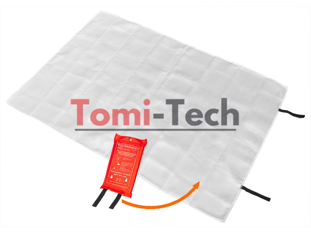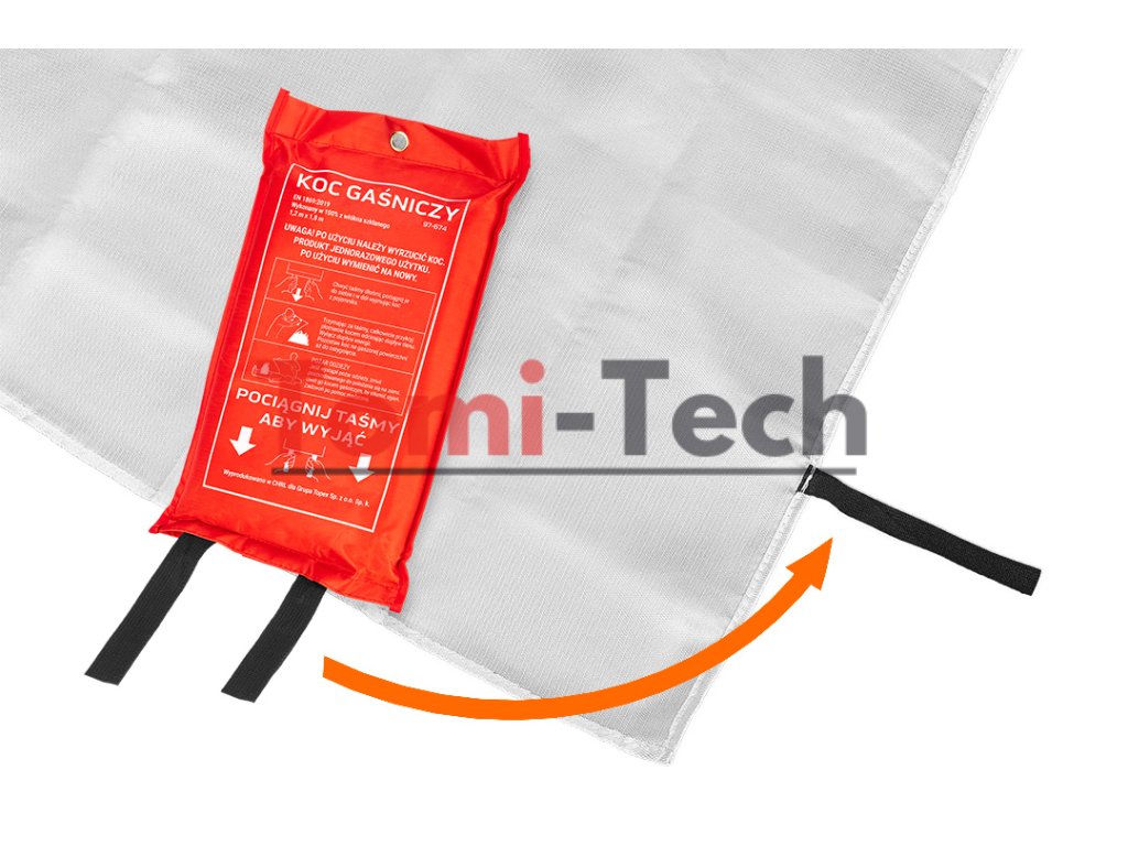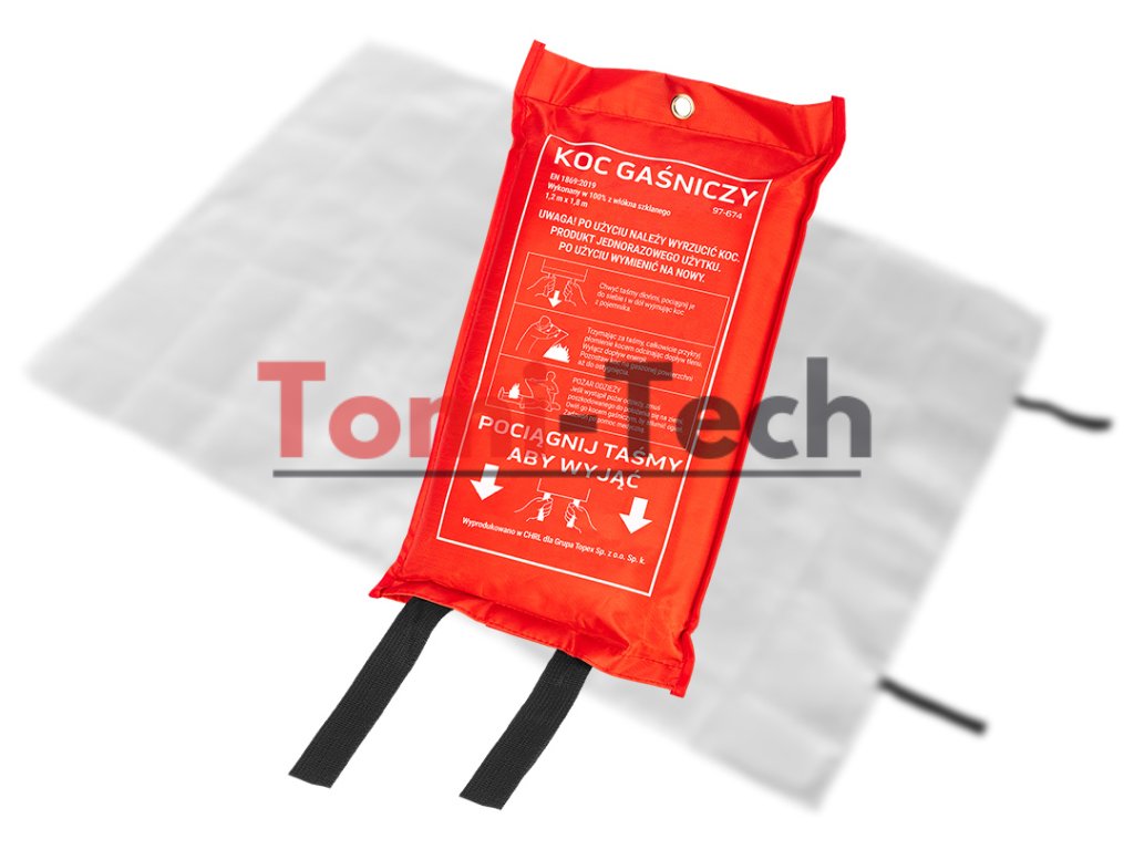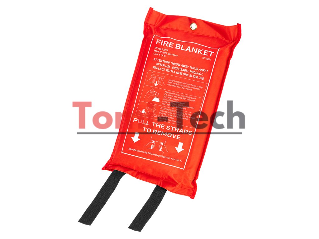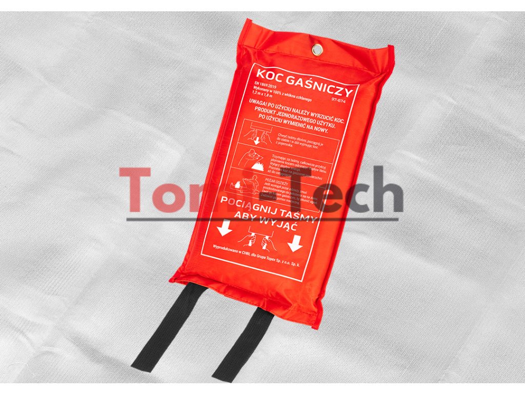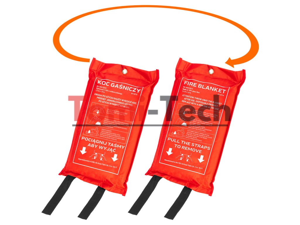 Protipožiarna deka, vyrobená zo 100 % sklolaminátu, rozmery 1,2 m x 1,8 m, zabalená v červenom obale s otvorom na zavesenie na stenu, nepriepustná pre mastnotu a olej, čo znižuje riziko opätovného vznietenia, odolná teplotám do 500 °C, certifikovaná CEDodatočné parametre