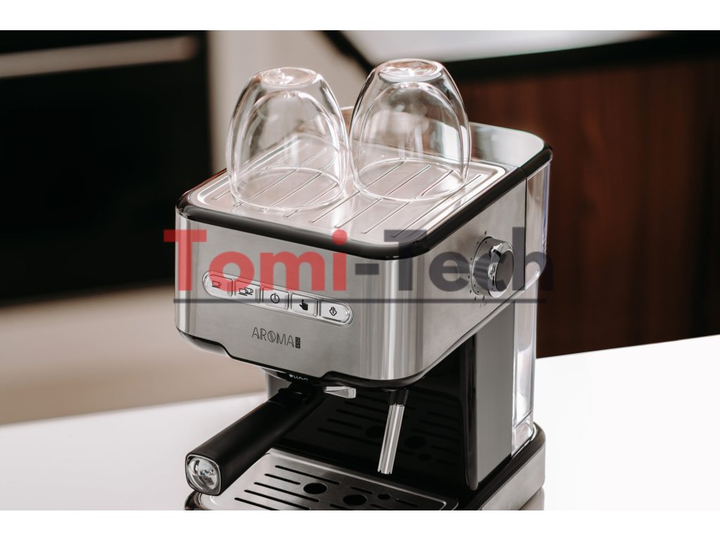 Tajomstvo aromatického espressa od AROMA Výhodou espressa 450 je presné lisovanie mletej kávy v portafiltri a čas lúhovania. Toto je doplnené vhodným tlakom – 15 barov – pri ktorom voda preniká do kávy a vytvára váš obľúbený nápoj.