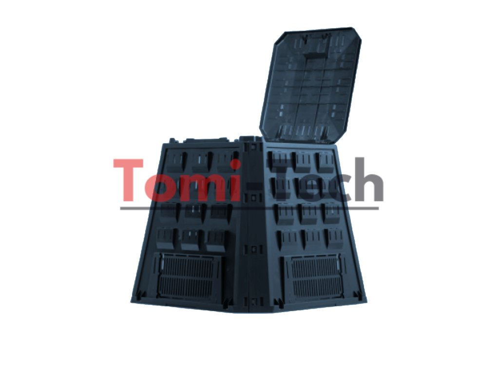 - Kompostér je vybavený výklopnými klapkami, ktoré poskytujú neustály prístup k vyrobenému kompostu, čo umožňuje hnojiť pôdu za určitých podmienok priebežne