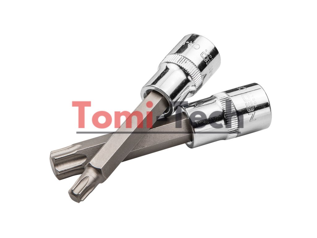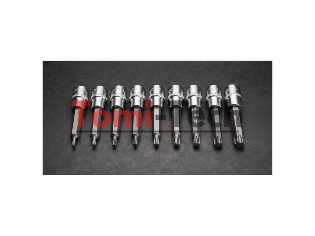 Bity Torx s objímkou 100 mm, sada 9 kusov, 1/2", objímka z CrV ocele, hrot z ocele S2, veľkosti: T20, T25, T27, T30, T40, T45, T50, T55, T60, certifikát TÜV M+T, 25-ročná záruka.Dodatočné parametre
