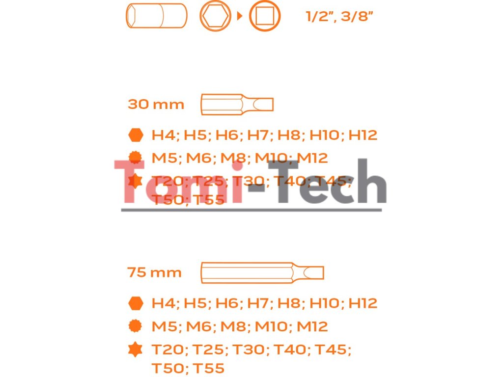 Sada skrutkovacích bitov, 40 ks (ref. č. 84-236) CrV, dĺžka HEX 30 mm: H4, H5, H6, H7, H8, H10, H12, dĺžka HEX 75 mm: H4, H5, H6, H7, H8, H10, H12, dĺžka drážky 30 mm: M5, M6, M8, M10, M12, dĺžka drážky 75 mm: M5, M6, M8, M10, M12, dĺžka Torx 30 mm: T20, T25, T30, T40, T45, T50, T55, dĺžka Torx 75 mm: T20, T25, T30, T40, T45, T50, T55, redukcie: 1/2"-10 mm, 3/8"-10 mm, profilovaná doštičkaDodatočné parametre