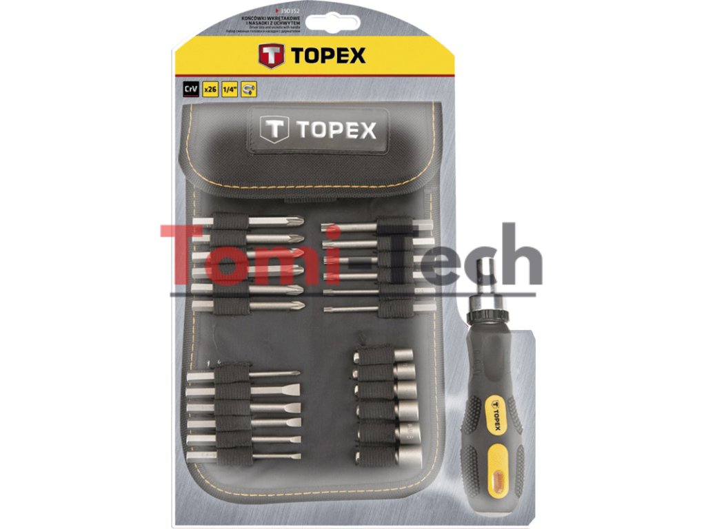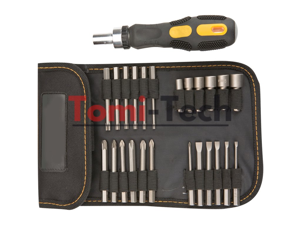 Bity a hlavice skrutkovača s držiakom, sada 26 kusov, 1/4", magnetický držiak na skrutkovač, 6 hlavíc skrutkovača, veľkosti: 5, 6, 7, 8, 9, 10 mm, 18 bitov skrutkovača, veľkosti: ploché: 3, 4, 5, 6, 7 mm, krížové PH0, PH1, PH2, PH3, PZ1, PZ2, PZ3, Torx: T10, T15, T20, T25, T27, T30, oceľ CrV, textilné puzdro.Dodatočné parametre