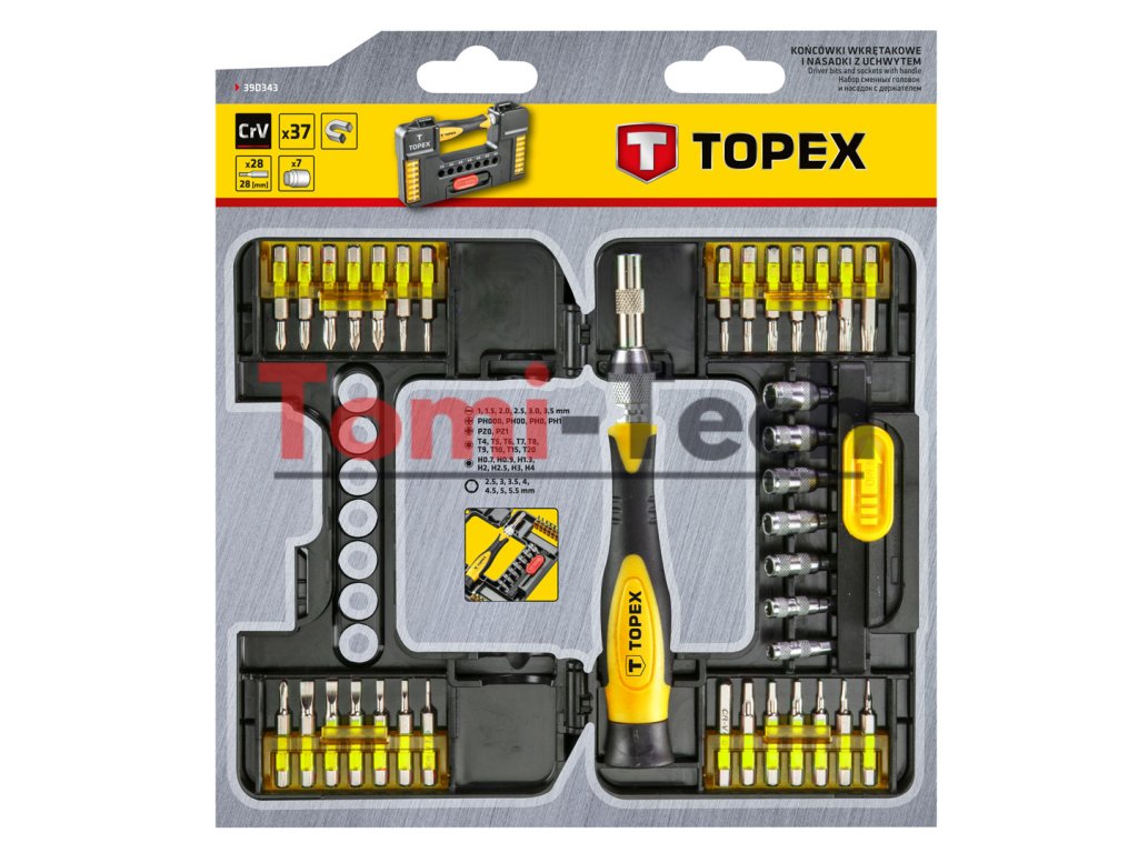 Presné skrutkovacie bity s držiakom (ref. č. 39D343), 37-dielna sada, držiak skrutkovača, predĺženie 100 mm, 28 presných skrutkovacích bitov, veľkosti: ploché 1 mm, 1,5 mm, 2 mm, 2,5 mm, 3 mm, krížové 3,5 mm PH000, PH00, PH0, PH1, PZ0, PZ1, Torx T4, T5, T6, T7, T8, T9, T10, T15, T20, šesťhranné H0,7, H0,9, H1,3, H2, H2,5, H3, H4, 7 veľkostí objímok: 2,5, 3, 3,5, 4, 4,5, 5, 5,5 mm, oceľ CrV, plastové puzdroDodatočné parametre