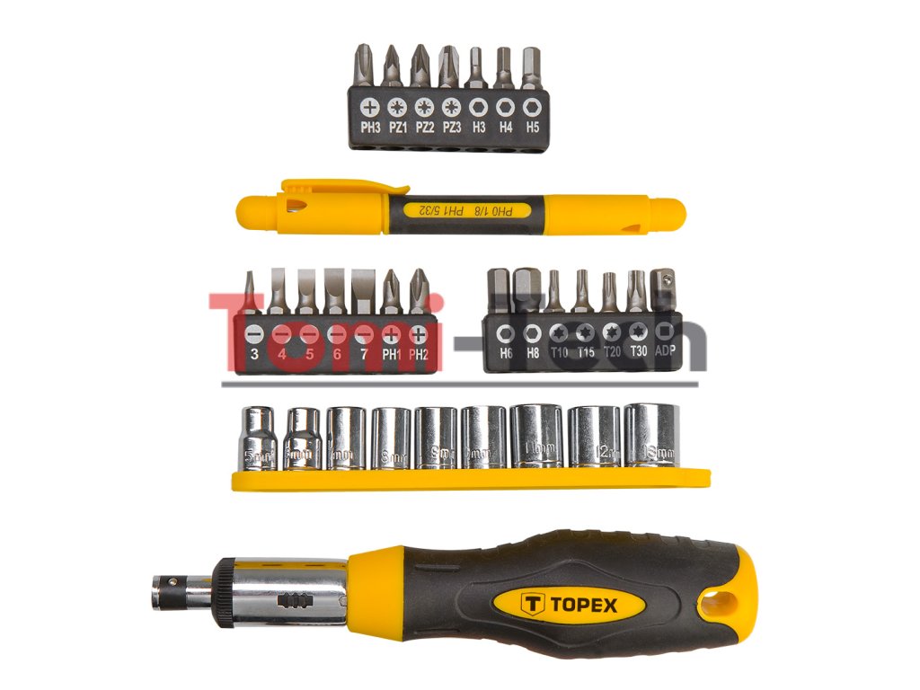 Bity skrutkovača s držiakom, dvojmateriálová račňová rukoväť s aretáciou vľavo, vpravo, bity: ploché 3, 4, 5, 6, 7 mm, PH1, PH2, PH3, PZ1, PZ2, PZ3, T10, T15, T20, T30, H3, H4, H5, H6, H8, štvorcový adaptér 1/4", šesťhran, šesťhranné objímky: 5, 6, 7, 8, 9, 10, 11, 12, 13 mm, držiak na pero s bitmi PH1 x 5, 32" a PH0 x 1, 8"Dodatočné parametre