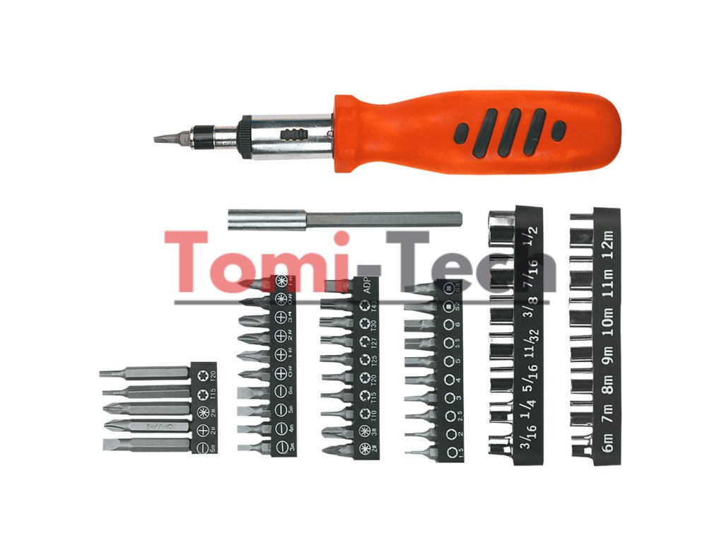Bity skrutkovača s držiakom, 52-dielna sada, veľkosti bitov 25 mm: ploché 3, 4, 5, 6, PH 0, 1, 2, 3, PZ 0, 1, 2, 3, TORX 10, 15, 20, 25, 27, 30, 40, HEX 1,5, 2, 2,5, 3, 4, 5, 5,5, 6, S2, S3, adaptér, veľkosti bitov 50 mm: ploché 6 mm, PH2, PZ2, T15, T20, šesťhranné objímky: 6, 7, 8, 9, 10, 11, 12, 3/16", 1/4", 5/16", 11/32", 3/8", 7/16", 1/2"Dodatočné parametre
