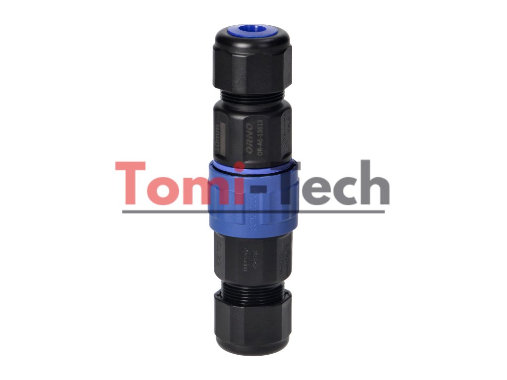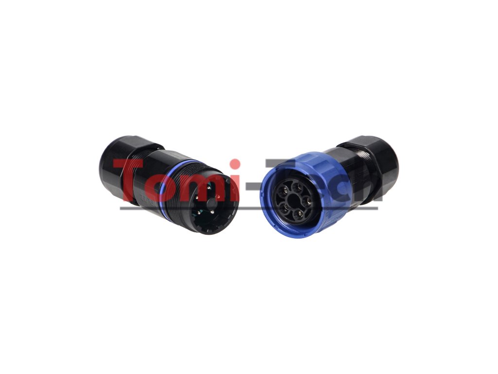 5-pinový káblový konektor s jednoduchým tvarom a pevnou, kompaktnou konštrukciou. Konektor sa skladá z dvoch prvkov – zásuvky a zástrčky, ktoré sú zaistené maticou, čo zaisťuje stabilné pripojenie. Tento typ káblového pripojenia umožňuje viacnásobné pripájanie a odpájanie, napríklad počas rekonštrukčných prác, a umožňuje vytváranie modulárnych káblových systémov. Vysoký stupeň krytia IP68 chráni pred vonkajšími faktormi. Materiál použitý v konektore je odolný voči UV žiareniu a vhodný na vonkajšie použitie. Produkt sa vyznačuje inovatívnym tesnením, vďaka čomu je vhodný aj pre podzemné inštalácie – zástrčka má O-krúžok a tesnenie, zatiaľ čo zásuvka a spoločné pripojenie pod maticou sú zaistené dvojitým O-krúžkom. Priechodka je vybavená dvojdielnym tesnením, ktoré umožňuje použitie širokej škály vodičov až do 5x4 mm² a zaisťuje tesné utesnenie. Uhlové skrutkové svorky umožňujú plné využitie pripojovacej svorky (do 4 mm²). Na inštaláciu konektorov je potrebný kľúč, ktorý poskytuje dodatočnú ochranu zariadenia pred nechceným zásahom tretích strán.Dodatočné parametre