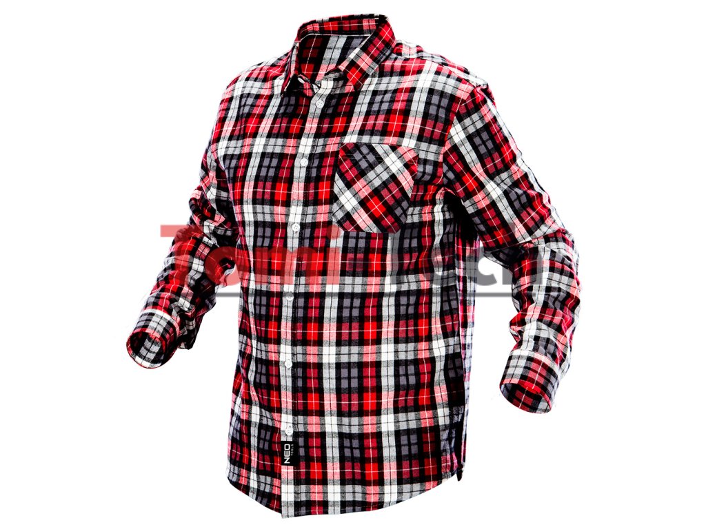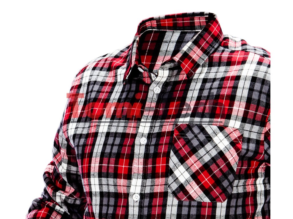 Flanelová košeľa, červeno-sivo-biely károvaný vzor, tkaná z predfarbenej priadze, 100 % bavlna, 180 g/m2, veľkosť L, certifikácia CEDodatočné parametre