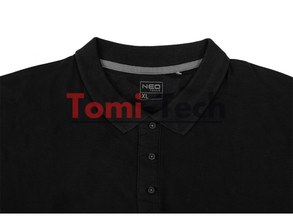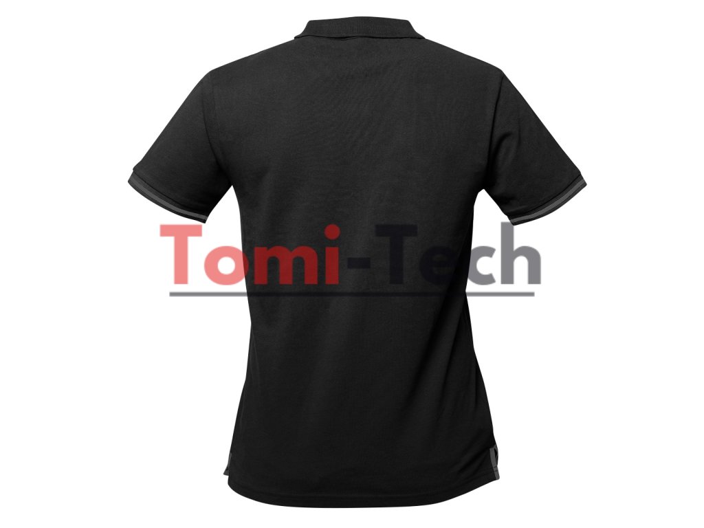 Džínsové polo tričko, čierne, veľkosť M, 100 % bavlna, 200 g/m2, pikéová tkanina, rebrovaný golier a konce rukávov, kontrastný prúžok v spodnej časti rukávov, bočné rozparky so stuhou, vnútorná menovka, jedinečný vlastný dizajn, ozdobné logo z imitácie kože, certifikát CE, zhoda s normou EN ISO 13688:2013Dodatočné parametre