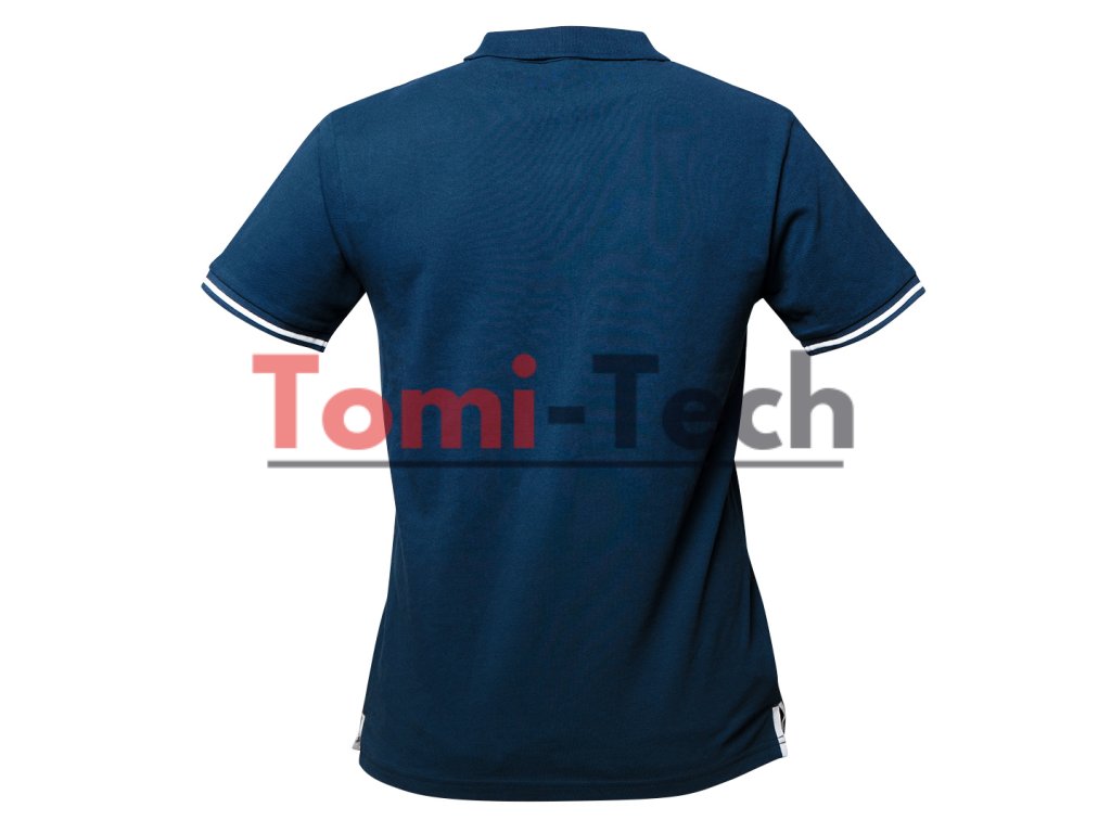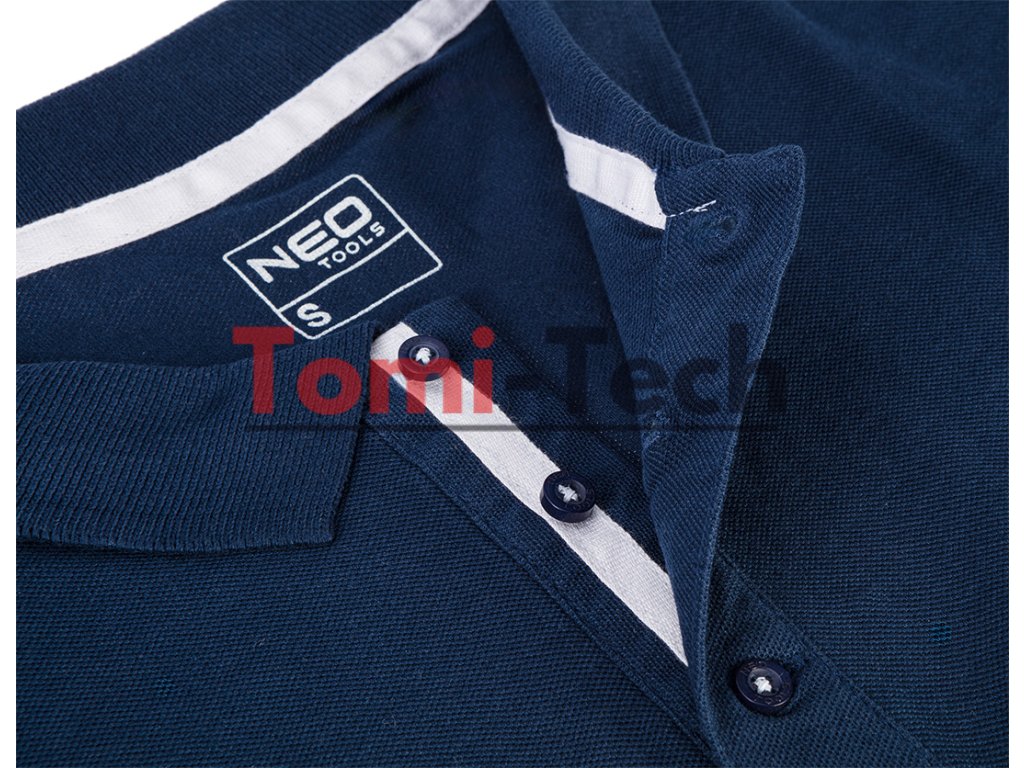 Džínsové polo tričko, veľkosť M, 100 % bavlna, 200 g/m2, pikéová tkanina, rebrovaný golier a konce rukávov, kontrastný prúžok v spodnej časti rukávov, bočné rozparky so stuhou, vnútorná menovka, jedinečný vlastný dizajn, certifikát CE, zhoda s normou EN ISO 13688:2013Dodatočné parametre