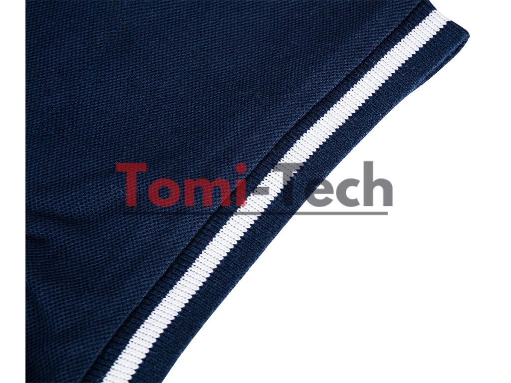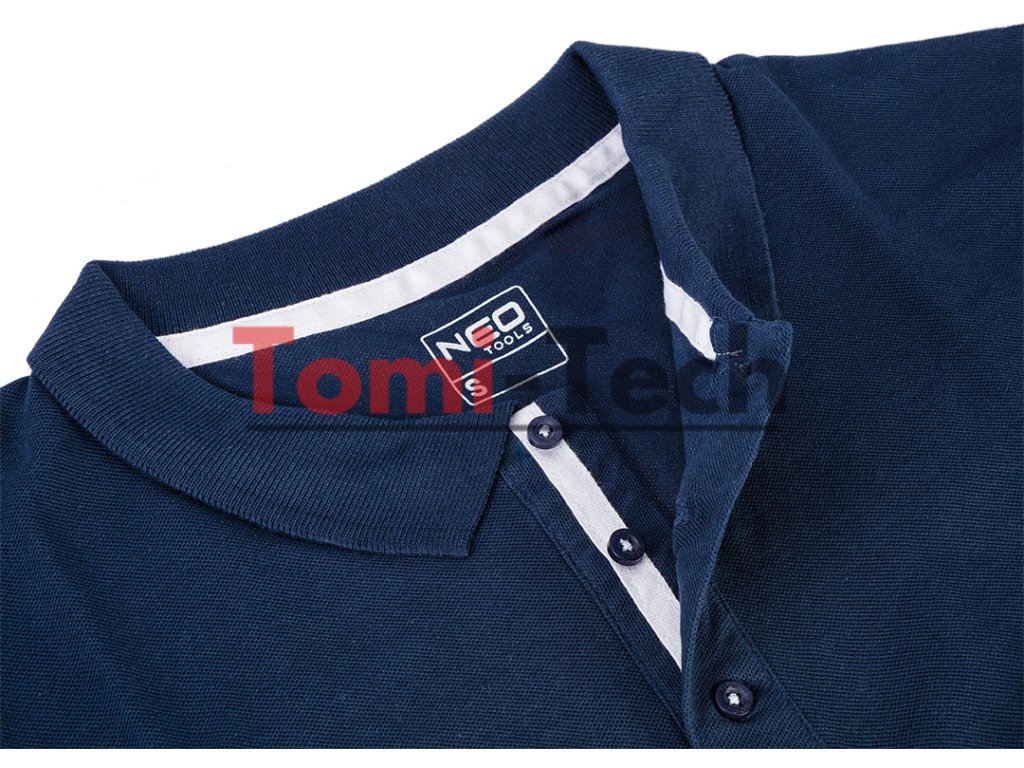Džínsové polo tričko, veľkosť XL, 100 % bavlna, 200 g/m2, pikéová tkanina, rebrovaný golier a konce rukávov, kontrastný prúžok v spodnej časti rukávov, bočné rozparky so stuhou, vnútorná menovka, jedinečný vlastný dizajn, certifikát CE, zhoda s normou EN ISO 13688:2013Dodatočné parametre