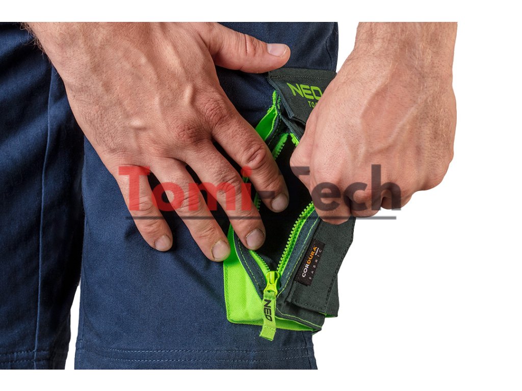 PRÉMIOVÉ šortky, 62 % bavlna, 35 % polyester, 3 % elastan, veľkosť XXL, gramáž 270 g/m2, prvky Cordura, materiál s elastanom pre väčšie pohodlie, odnímateľné vrecko, opasok súčasťou balenia, nastaviteľný pás, multifunkčné, priestranné vrecká, vnútorná menovka, jedinečný vlastný dizajn, certifikát CEDodatočné parametre