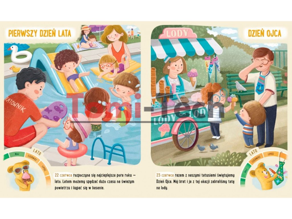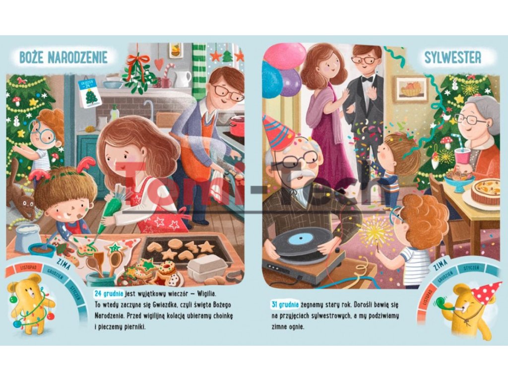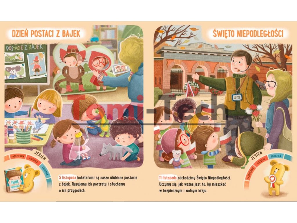 Toto všetko sa dieťa učí pozorovaním zmien v prírode a prežívaním zvláštnych príležitostí a sviatkov. Preto sa v najnovšom zväzku Feluś a Gucio zúčastňujú rôznych osláv. Sú tam opisy ľudových, náboženských, národných, predškolských a súkromných sviatkov a časové koleso zobrazuje názov mesiaca, do ktorého každá udalosť spadá.