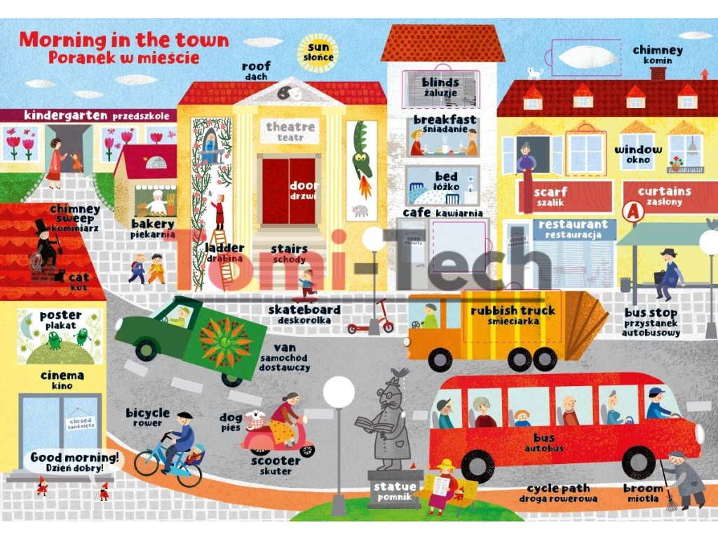 „Moja prvá poľsko-anglická encyklopédia s Windowsami“ je vzdelávacia séria, ktorá pomáha malým deťom objavovať svet a učiť sa anglické slová. Táto sekcia obsahuje slovnú zásobu súvisiacu s mestom: názvy miest a budov, povolania, vozidlá, produkty, ktoré si môžeme kúpiť, a mnoho ďalších detailov – spolu viac ako 200 slov. Na každej strane môžete nájsť a otvoriť okná (v celej knihe ich je 50), čo vám umožní objaviť ďalšie detaily a slová.