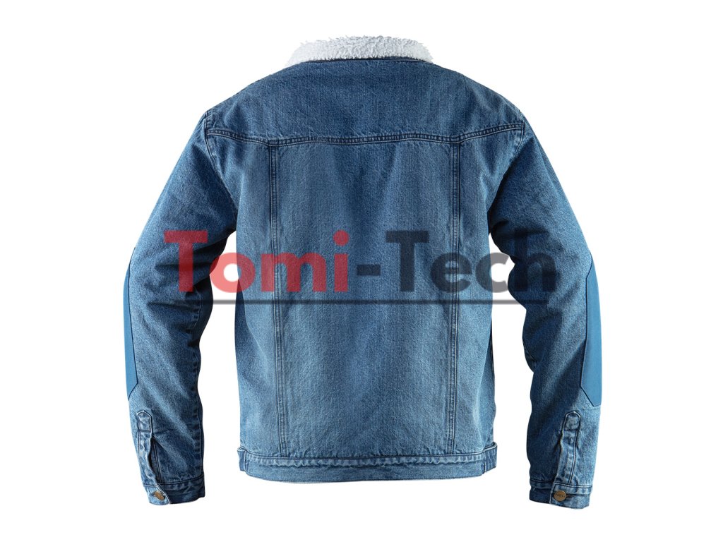 Zateplená džínsová bunda DENIM, hlavný materiál denim 100% bavlna, výplň 100% polyester, výstuhy Oxford 100% bavlna, výstuhy na lakťoch a vreckách z bavlny Oxford, izolácia zaisťujúca tepelný komfort pri nižších teplotách, zapínanie na gombíky, nastaviteľná šírka bundy, kožené vsadky s logom, vnútorná vsadka s menom, jedinečný vlastný dizajn, CE, veľkosť LDodatočné parametre