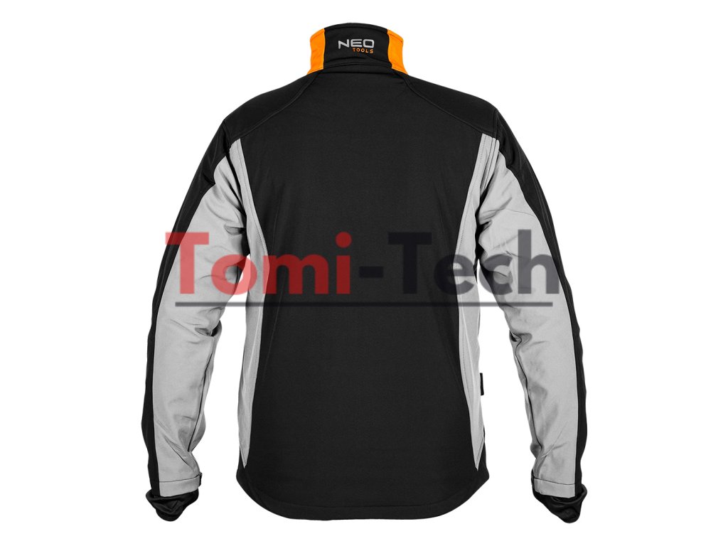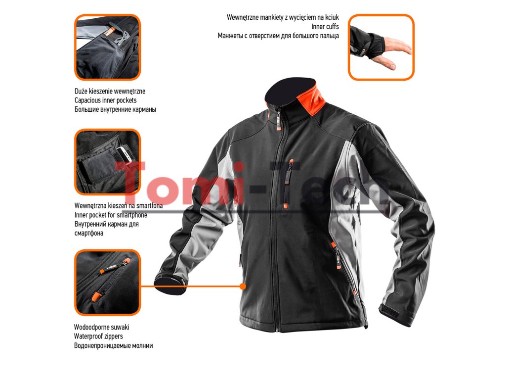 Pracovná bunda, veľkosť XL/56, vyrobená z vysoko kvalitnej softshellovej tkaniny, vodeodolná 5000 mm, priedušná 3000 g/m2/24h, vetruodolná, manžeta na palec, flísová vnútorná strana, vrecko na telefón, sťahovacia šnúrka v spodnom šve, certifikácia CEDodatočné parametre
