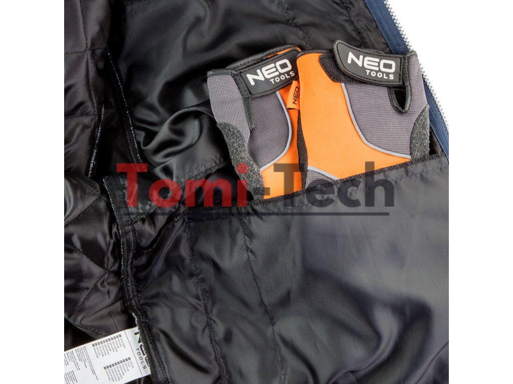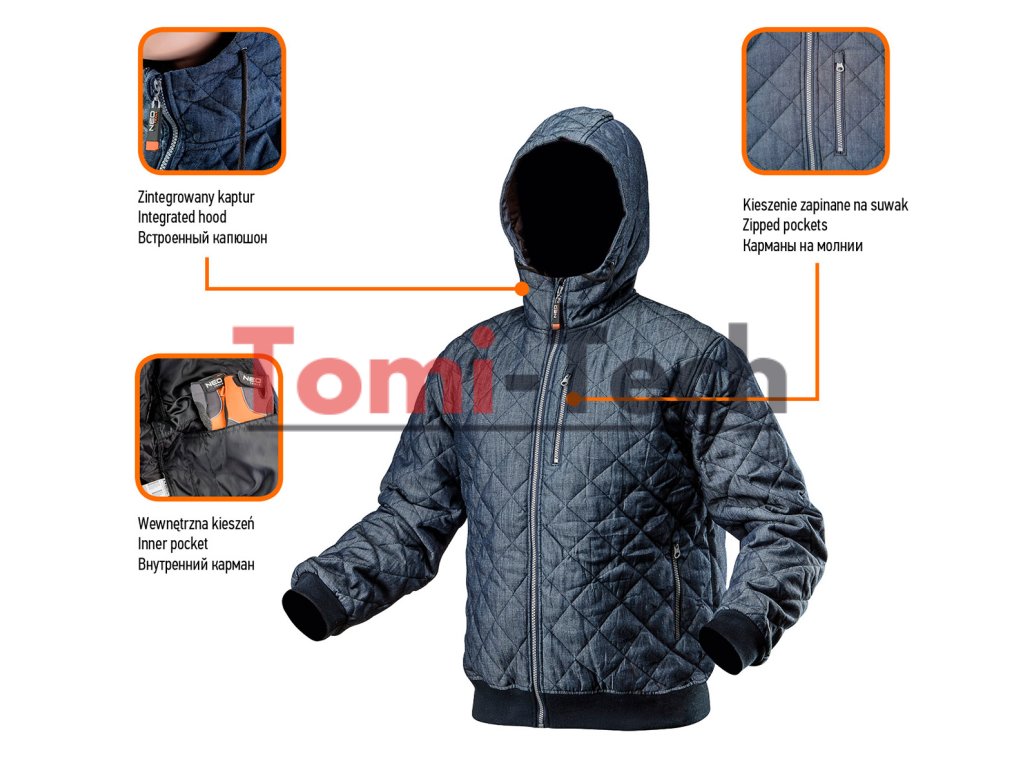 Prešívaná pracovná bunda, veľkosť M, 70 % bavlna a 30 % polyester, vrecká na zips, elastické manžety a pás, integrovaná kapucňa so sťahovacou šnúrkou, izolácia 100 % polyester, certifikácia CEDodatočné parametre