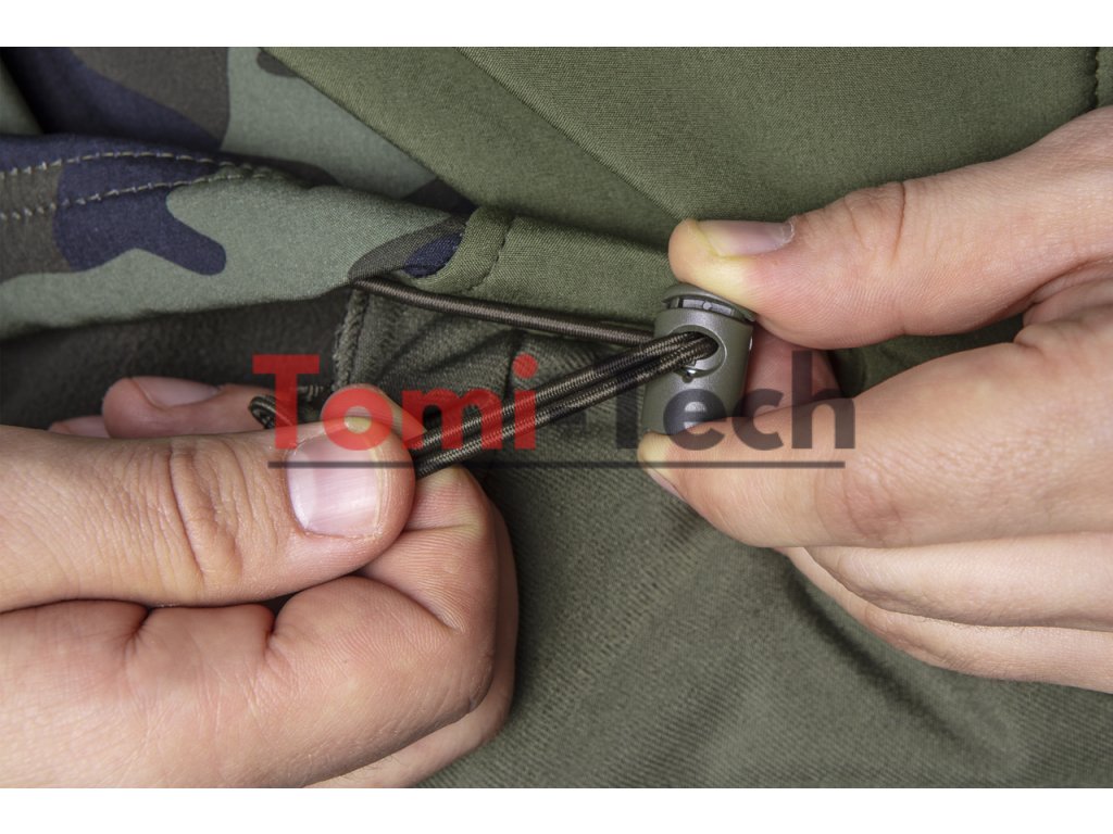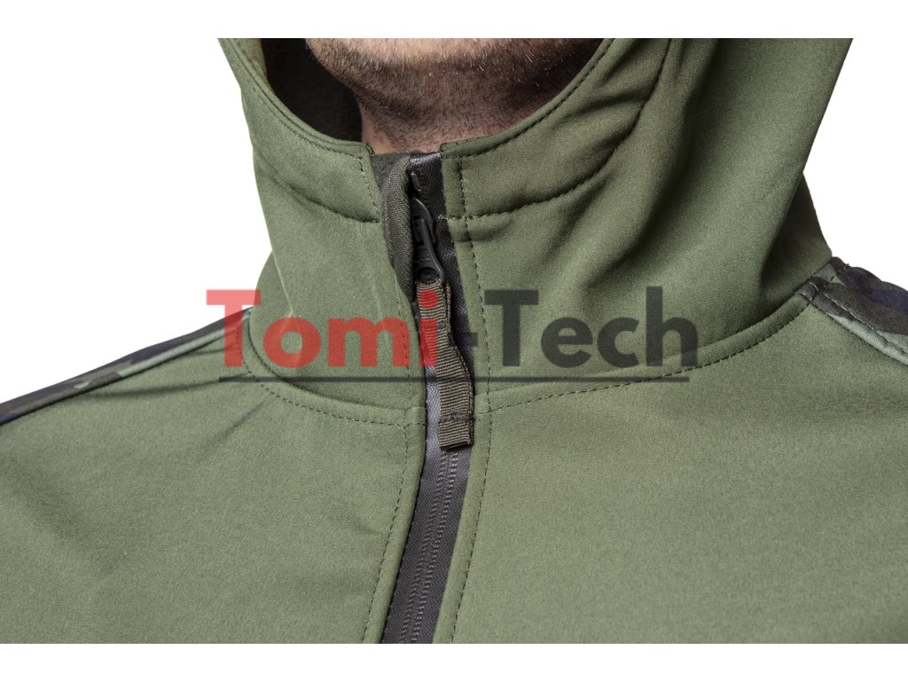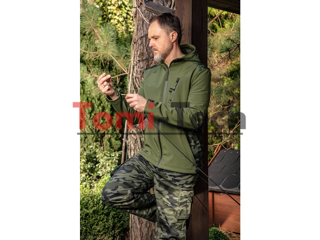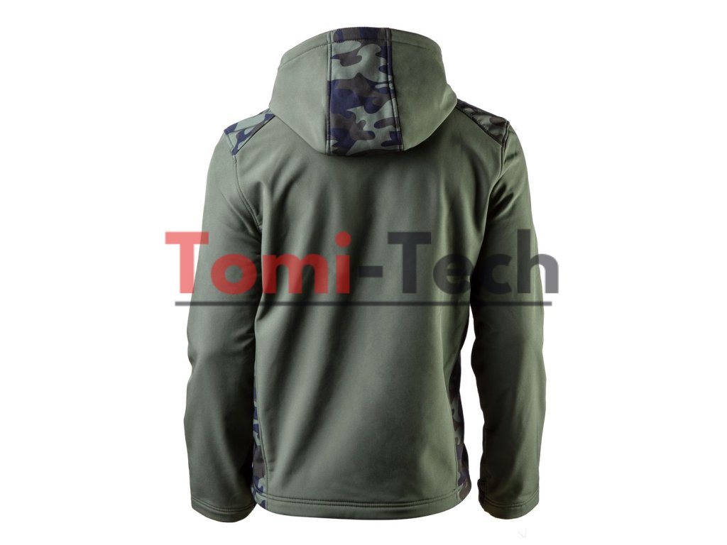 Softshellová bunda CAMO, veľkosť XXL, vyrobená z vysoko kvalitnej softshellové tkaniny, s kapucňou, vodeodolnosť 5000 mm, priedušnosť 3000 g/m2/24h, vetruodolná, vodeodolné zipsy, flísová vnútorná strana, sťahovacia šnúrka v spodnom šve, 3 vrecká (vrátane 2 so zipsom), nastaviteľný obvod manžety, identifikačná vložka, certifikát CEDodatočné parametre