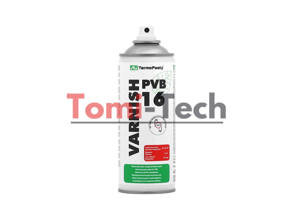 Rýchloschnúci, transparentný PVB náter s vynikajúcimi izolačnými vlastnosťami. Chráni dosky plošných spojov a ďalšie súčiastky pracujúce v nepriaznivých poveternostných podmienkach pred koróziou. Náter chráni dosky plošných spojov pred bludnými prúdmi a skratmi. VLASTNOSTI: Vytvára ochrannú a izolačnú vrstvu, ktorá chráni pred atmosférickými vplyvmi, ako je vlhkosť, oxidácia, prach a chemické kontaminanty. Dobre priľne k kovovým, plastovým a dreveným povrchom. Vytvára povlak odolný voči zriedeným kyselinám, zásadám a atmosférickým vplyvom. Umožňuje spájkovanie cez vrstvu laku. Zabraňuje iskreniu a korónovému výboju. Znižuje prierazy medzi dráhami. Nemení transparentnosť a flexibilitu ani po dlhej dobe; Prevádzková teplota -50°C +150°C. Bod vzplanutia +380°C. Rozsah aplikačných teplôt: od -40°C +60°C. POUŽITIE: Izoluje a chráni široko chápanú elektroniku, dosky plošných spojov, káble a vodiče, vysokonapäťové transformátory, cievky elektromotorov; V automobilovom priemysle na zabránenie skratom a krátkym spojom; Utesňuje plastové kryty zástrčiek a zásuviek; V energetike a elektromechanike vytvára ochranné vrstvy.Dodatočné parametre
