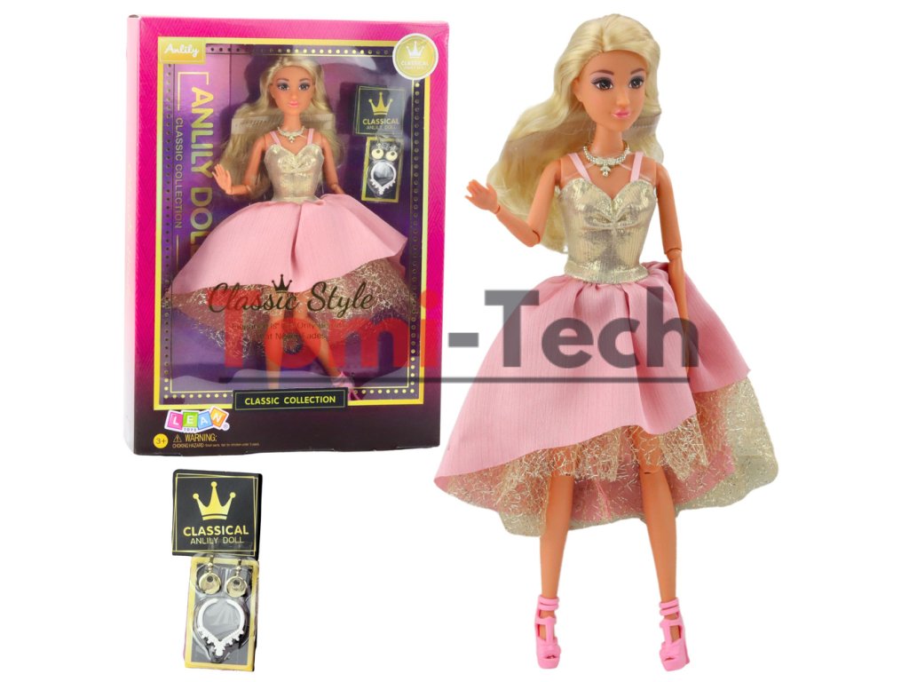 Bábika Anlily v elegantných plesových šatách so zlatými a ružovými doplnkami