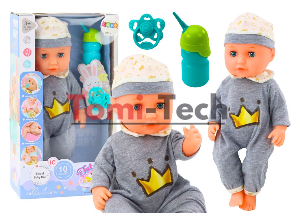 Bábika v pôvabnom sivom pyžame s farebným motívom zlatej koruny je perfektnou hračkou pre deti, ktoré sa rady starajú o svoje bábiky a napodobňujú dospelých. Jej mäkké a na dotyk príjemné pyžamo a klobúčik jej dodávajú neuveriteľne realistický vzhľad a povzbudzujú k hre.