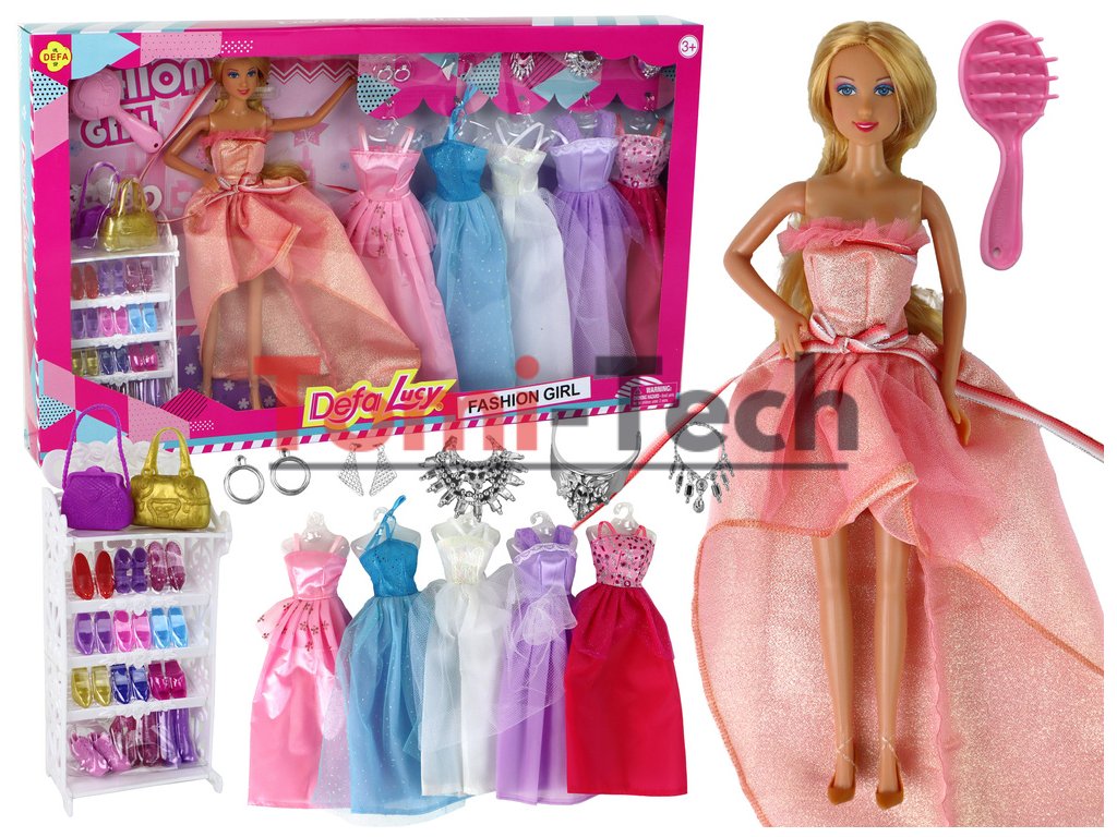 To nie je všetko! Sada obsahuje aj elegantný biely šatník s 12 pármi topánok na vysokých podpätkoch na prezliekanie. Bábika má k dispozícii 5 rôznych večerných šiat, vrátane bielych, fialových, tmavoružových, modrých a svetloružových, s tylovými doplnkami a trblietavými ozdobami. Sada je navyše bohatá na doplnky, ako sú 2 páry strieborných náušníc, 2 kabelky (fialová a zlatá), 3 náhrdelníky, sponka do vlasov a kefa na vlasy.