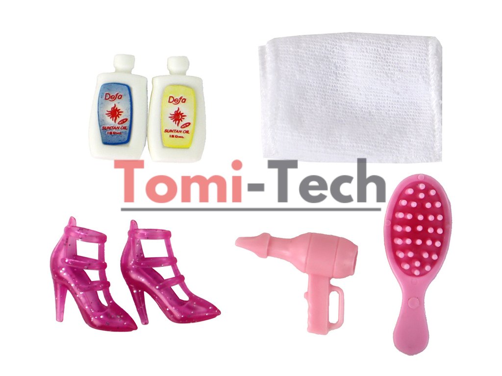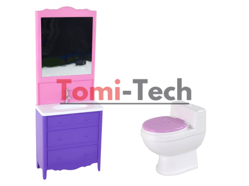 Sada obsahuje príslušenstvo, ktoré umožňuje kompletnú starostlivosť o bábiku. Biely uterák, ružová kefa, náhradné ružové vysoké podpätky, fén, biela vaňa s rozmermi 23 cm x 10 cm x 13 cm, toaleta s ružovým vekom a umývadlo s fialovo-ružovou skrinkou a zrkadlom s rozmermi 29 cm x 11 cm x 5 cm.