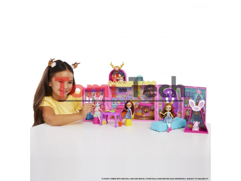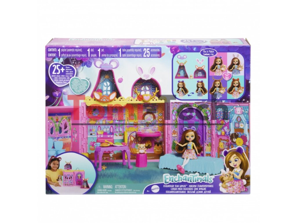 V Domčeku priateľstva Enchantimals sú vítaní všetci! Príďte a objavte transformačnú hernú sadu a možnosti voľnej hry, ktoré vytvárajú nekonečné herné možnosti pre bábiky a ich priateľov. Otvorte domček pre bábiky a objavte sedem herných zón vrátane kuchyne, kúpeľne, spálne a dokonca aj strešného bazéna! Zvýšte zábavu s 24 doplnkami a vytvorte si v tomto očarujúcom domčeku množstvo jedinečných príbehov Enchantimals. Nielenže sú k dispozícii doplnky pre bábiku a domáceho maznáčika, ale aj štyri páry zvieracích uší na ozdobenie domčeka. Nechajte svoju fantáziu plynúť! Skvelý darček pre deti od 4 rokov, najmä pre tie, ktoré sa rady hrajú na domček s priateľmi. Farby a dekoratívne prvky sa môžu líšiť.