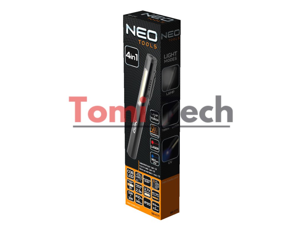 Inšpekčná lampa 4 v 1, laserová, 365nm UV lampa, svietidlo, 450lm, COB LED, funkcia stmievania, kábel USB-C, hliníkové telo, čas nabíjania 3h, čas prevádzky 2,5h, klip na vrecko, magnet v klipe, 3,7V 800mAh Li-ion batéria, indikátor nabitia batérie, svietidlo 140lm / 3W, IP20, rozmer 165x23mmDodatočné parametre