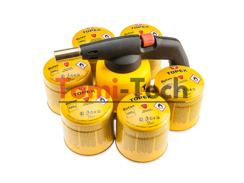 Plynový horák na 190g kartuše, prevádzková teplota 1350°C, výkon 1,9 kW, priemerná spotreba plynu 180 g/h, plastové puzdro. 6 x 190g butánové kartuše, systém na uzatváranie plynu.Dodatočné parametre