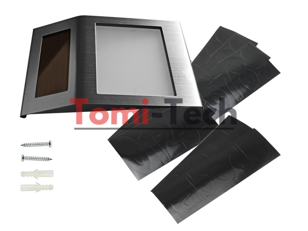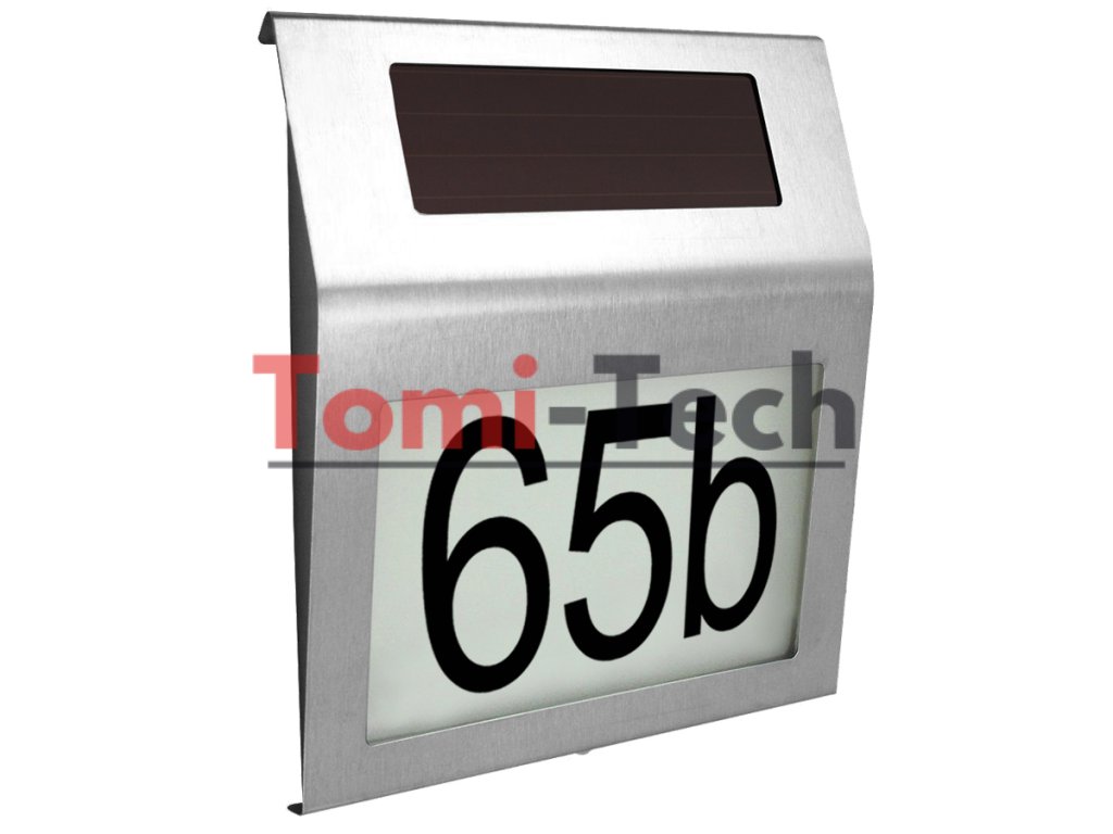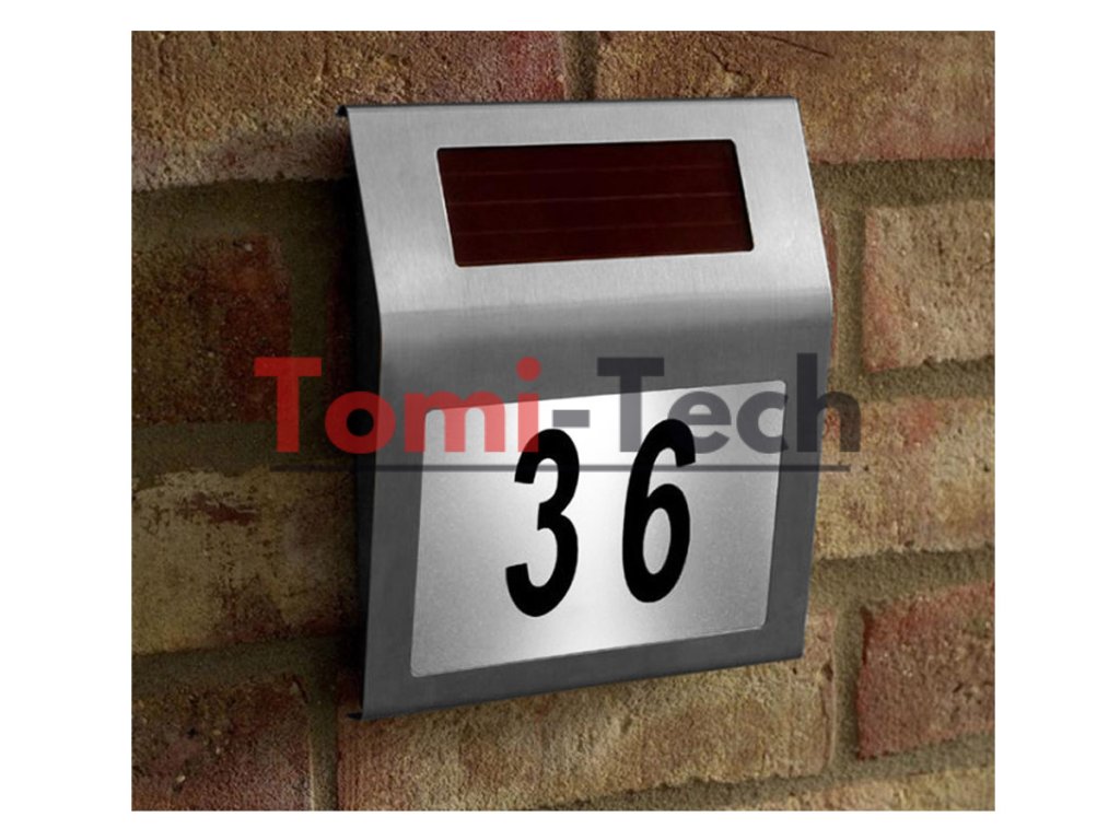 LED lampa využíva solárnu energiu uloženú vo vstavanej, účinnej 600 mAh batérii počas dňa. Podsvietenie sa automaticky zapne po zotmení. Dve LED diódy zabezpečujú dlhotrvajúcu prevádzku a vynikajúcu viditeľnosť čísla budovy v tme. Veľmi esteticky príjemný výrobok vyrobený z hrubej nehrdzavejúcej ocele. Možné je akékoľvek písanie číslic a písmen. Sada obsahuje 3 listy od 0 do 9 a 1 list písmen od calicali po calihcali. Produkt sa ľahko inštaluje a používa, sada obsahuje hmoždinky pre jednoduchú montáž na stenu. Solárny panel: 2V 80mA. IP 44. Výdrž batérie: 12-14 hodín. Typ batérie: Ni-Mh 1,2V 600mAh. Vypínač: automatický a manuálny. Počet LED diód: 2. Životnosť: - 50 000 hmateriál: nehrdzavejúca oceľ